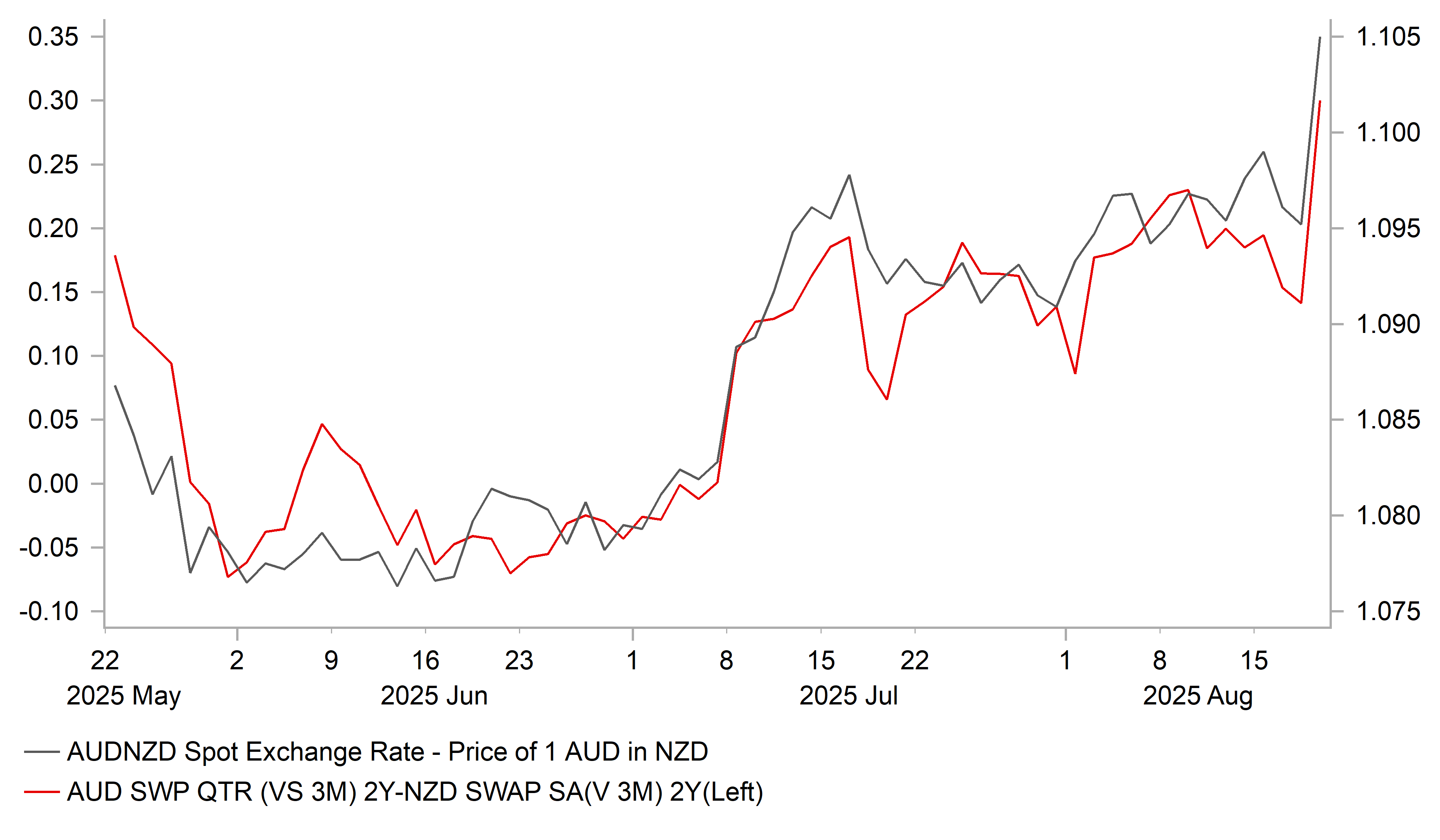 The dovish policy communication reflects more concern over the recent loss of growth momentum. The RBNZ stated that “New Zealand’s economic recovery stalled in the second quarter of this year” with spending by households and businesses constrained by global economic policy uncertainty, falling employment, higher prices for some essentials, and declining house prices. The unemployment rate had risen to a new cyclical high of 5.2% in Q2. The RBNZ’s updated forecasts for economic growth were revised down to show growth of just 1.1% for the 12 months through to March 2026 compared to the previous forecast of 1.5%. The RBNZ’s more aggressive easing cycle continues to remain a headwind for kiwi performance. The kiwi and other commodity currencies have also been undermined by the deterioration in investor risk sentiment in recent days. A sell-off in US tech stocks (Nasdaq down -1.5% yesterday) has contributed to the NZD, AUD and NOK underperforming this week while the safe haven currencies of the JPY and CHF have outperformed.