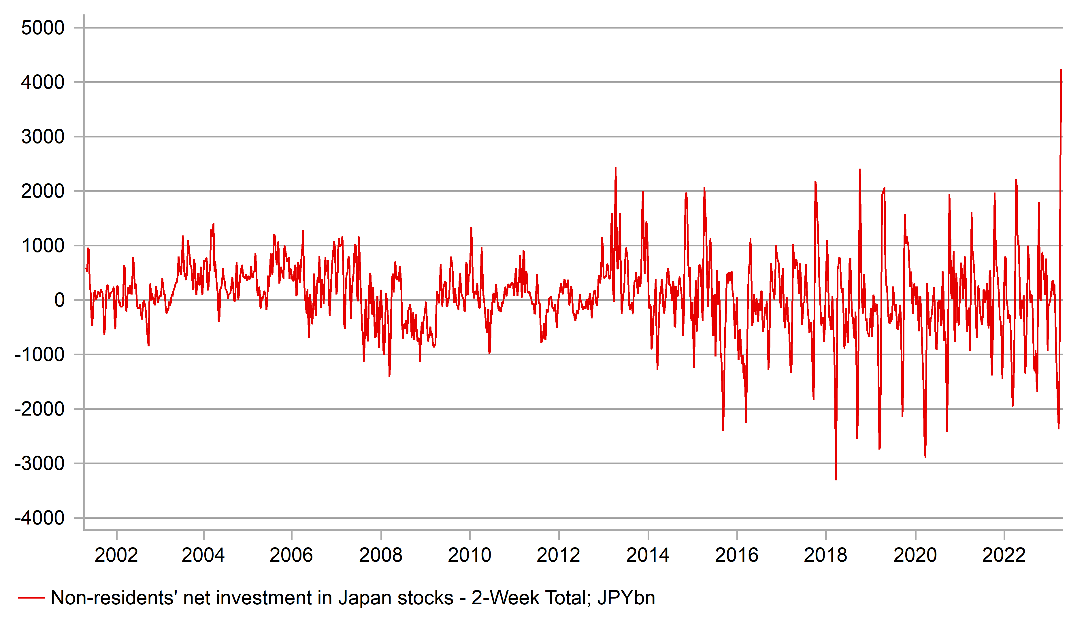 The weekly MoF cross-border flow data doesn’t get too much attention but the data released yesterday was certainly eye-popping! The data revealed exceptionally strong buying of Japan stocks by foreign investors – in the week to last Friday, purchases totalled JPY 1,876bn but followed even larger purchases the week before, totalling JPY 2,369bn. That previous week is a record in the data series back to 2001 and this week’s is the second largest total. The two-week combined purchase total was JPY 4,245bn.