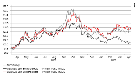 Investor sentiment had already taken a hit from the data released earlier with the ‘Philly Fed’ business outlook plunging to -31.3, the lowest level since the GFC in 2009 when the covid period is excluded. The tumble is another strong signal that the US is heading for recession. The initial claims data was also signalling labour market weakness with an increase to 245k, close to recent highs and up nearly 50k from the lows recorded in January. The jobs market really is the primary economic reasoning for the Fed to continue tightening and we see the window on that reasoning closely pretty quickly from here which will mean the May FOMC will be when rates are raised for the last time. What is telling from a global growth outlook is the turnaround of crude oil prices since the OPEC+ production cut announcement. That bounce is close to fully reversed now underlining the increasing expectations of weakening growth ahead.