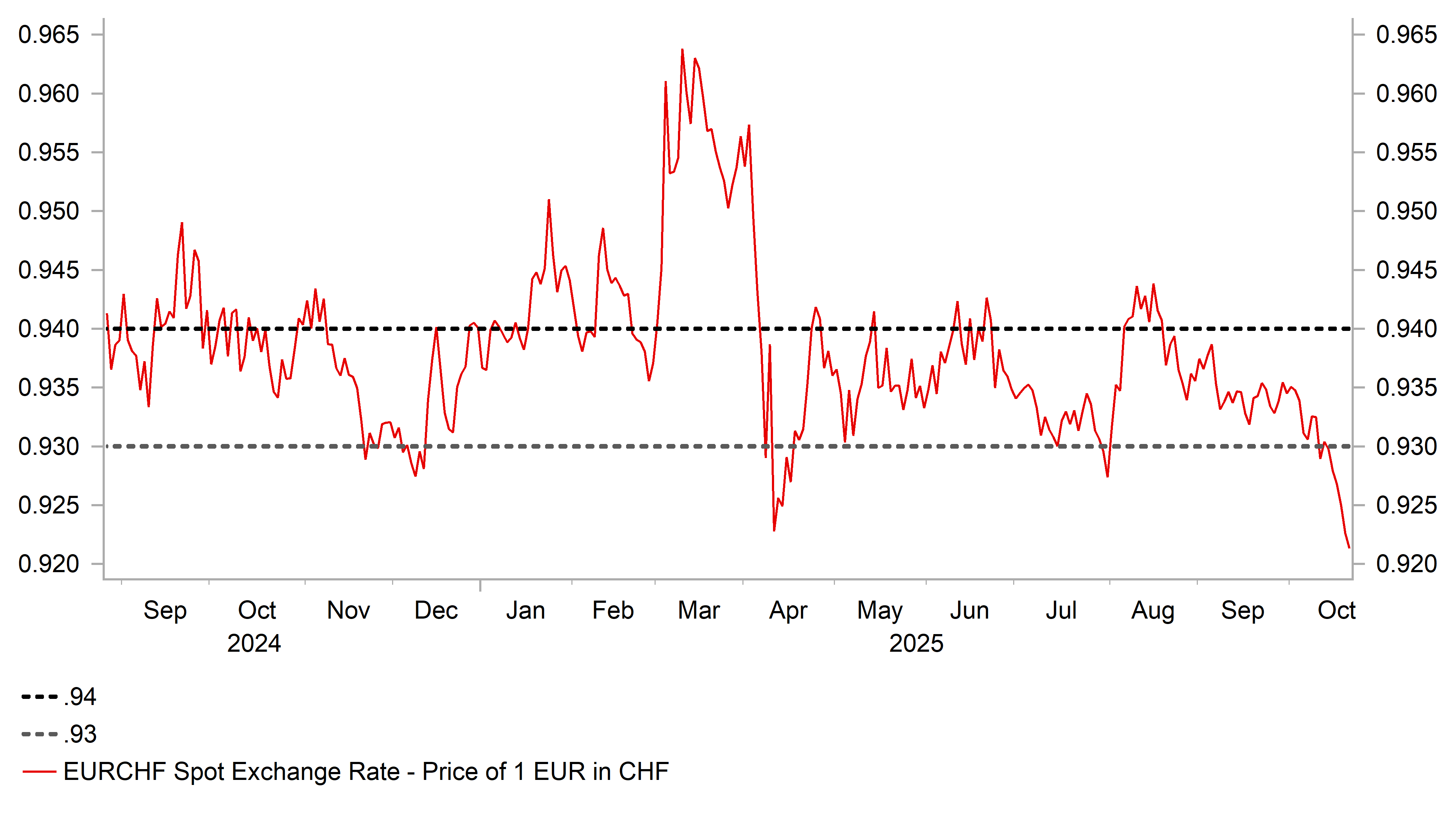 At the same time, the Swiss franc has been supported recently by the renewed upturn in political uncertainty in France. While French Prime Minister Lecornu was able to survive two votes of no confidence last week, he still faces a difficult challenge to secure enough support to pass his budget plans for next year through parliament. The deteriorating fiscal outlook was highlighted by the decision late last week from S&P to downgrade France’ credit rating by one notch to A+. It follows a similar decision last month from Fitch. The initial negative impact from the credit rating downgrade on the French government bond market and the euro has been relatively muted.