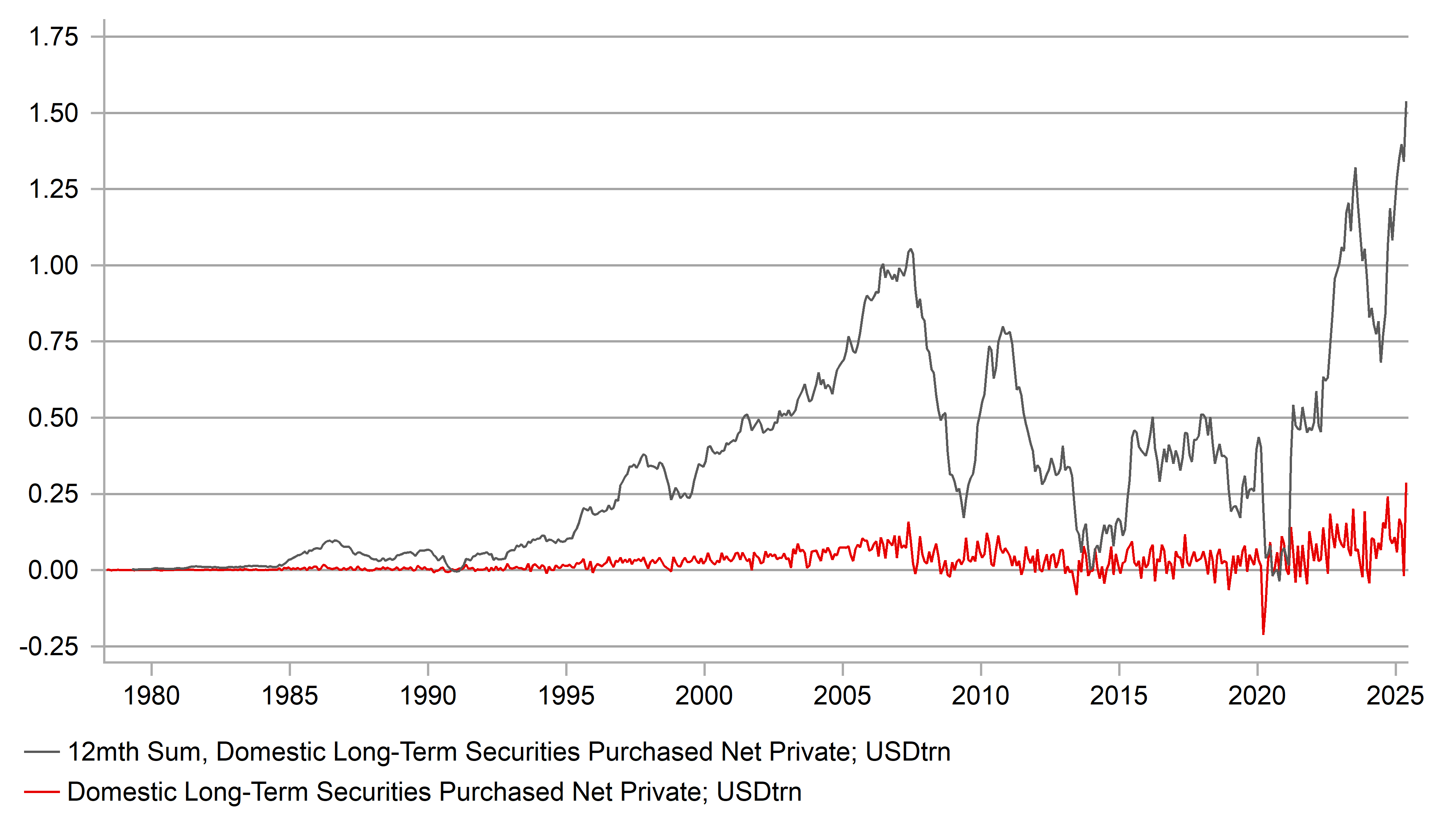 The huge inflows do offer some counter-balance to the speculation of a demise in “US exceptionalism” that was popular when the dollar was falling sharply. Of course, as we point out, the surge in inflows is a function of the record trade deficit (the 12mth trade deficit is around USD 1.3trn, the 12mth portfolio securities inflow was USD 1.5trn) and hence an important part of the equation is the hedging behaviour of foreign investors and the performance of the dollar could certainly entice greater hedging appetite especially if/when the FOMC restart its cutting of the policy rate probably later this year.