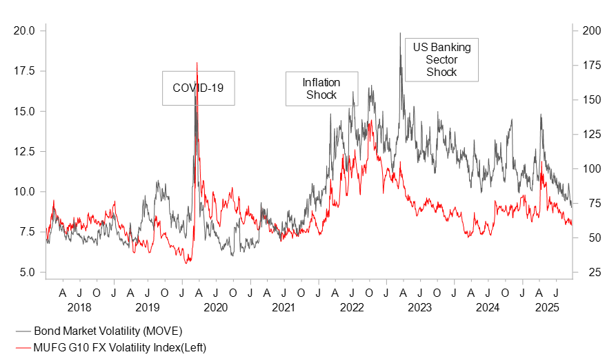 The rebound of the US dollar after the FOMC meeting last Wednesday looks to be losing steam already and the strength of the dollar always looked to be more a case of positioning in a market that had become a little over-extended on the Fed dovish side that means the FOMC communication was always likely to disappoint. Trading yesterday was relatively quiet and fixed income in particular with only marginal moves in yields. With close to two further rate cuts fully priced for the Fed the immediate outlook for risk remains positive. Declining volatility is fuelling renewed appetite for risk that is being helped by a macro backdrop that is improving. The TikTok deal and the positive news of a constructive call between Presidents Trump and Xi is easing concerns over any renewed escalation in trade tensions.