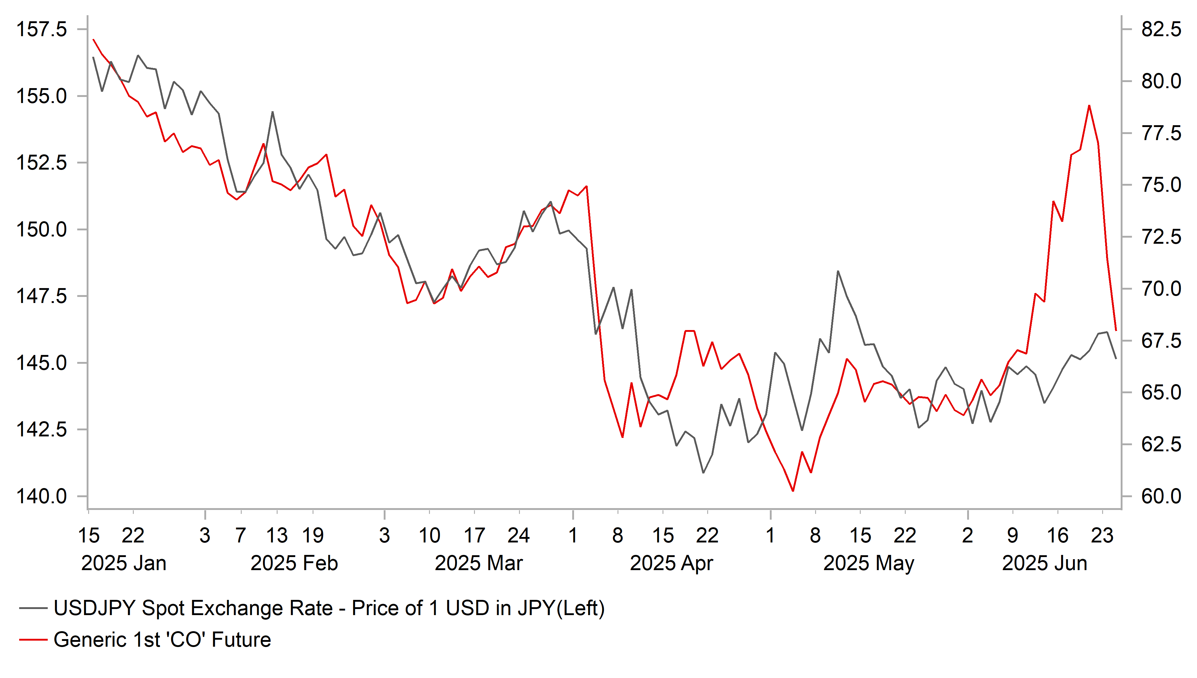 A potential end to the conflict has been welcomed by market participants. The price of Brent crude oil has dropped back sharply back towards USD68/barrel after hitting a peak at the start of this week at USD81.40/barrel. It has now almost fully reversed all of the gains since the conflict started. In the FX market a similar reversal is underway with the US dollar giving back recent gains. If Middle East risks now fade into the background as a market driver, it is more likely that the US dollar weakening trend will resume. On the other hand, the yen, Swedish krona, Norwegian krone and New Zealand dollar, which were hit the hardest by the recent pick-up in geopolitical risks, have some scope to rebound further in the near-term if the ceasefire holds.
