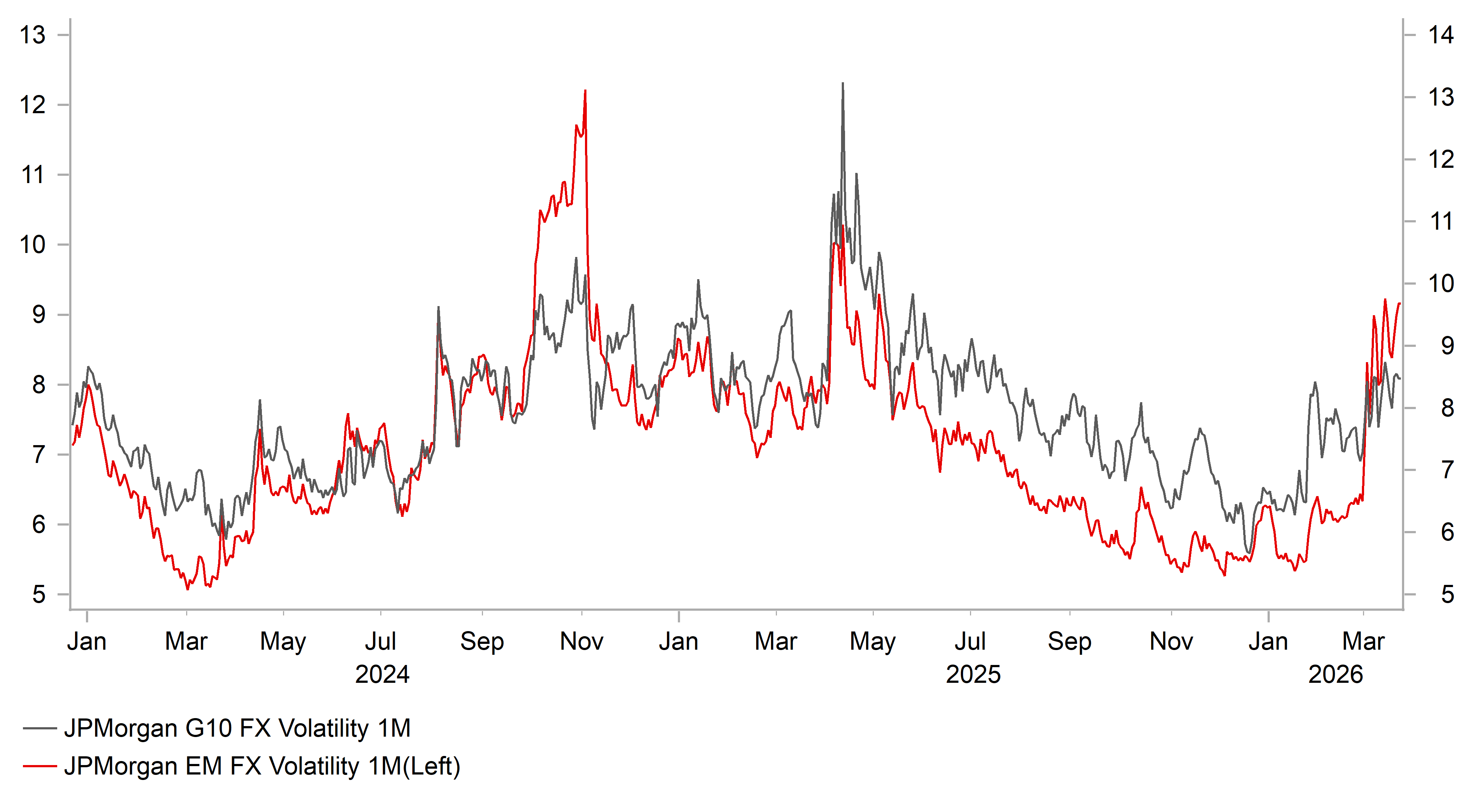 President Trump’s decision to step back from striking energy infrastructure in Iran for at least five days to allow for negotiations with Iran, has helped to reduce the immediate risk of further damage to energy sites in the Middle East. Iran had threatened to retaliate by launching further attacks on energy sites in the Middle East. However, it remains highly uncertain if the talks will prove successful and bring a quicker end to the conflict. For financial markets what matters most is whether energy supply is able to normalize through the Start of Hormuz. It currently remains effectively closed which if not resolved in the coming weeks and months could deliver an even bigger negative energy price shock for the global economy. We continue to hope that the risk of a bigger energy price spike will keep pressure on all parties to continue to de-escalate. While the conflict and energy supply disruption continues, foreign exchange markets are likely to remain volatile. The pick-up in volatility has been has greater for emerging market currencies than for G10. JPMorgan’s measure of one-month EM FX volatility has risen to the highest levels since last April following President Trump’s “Liberation Day” tariff announcements while G10 FX volatility is still well below levels from last April.