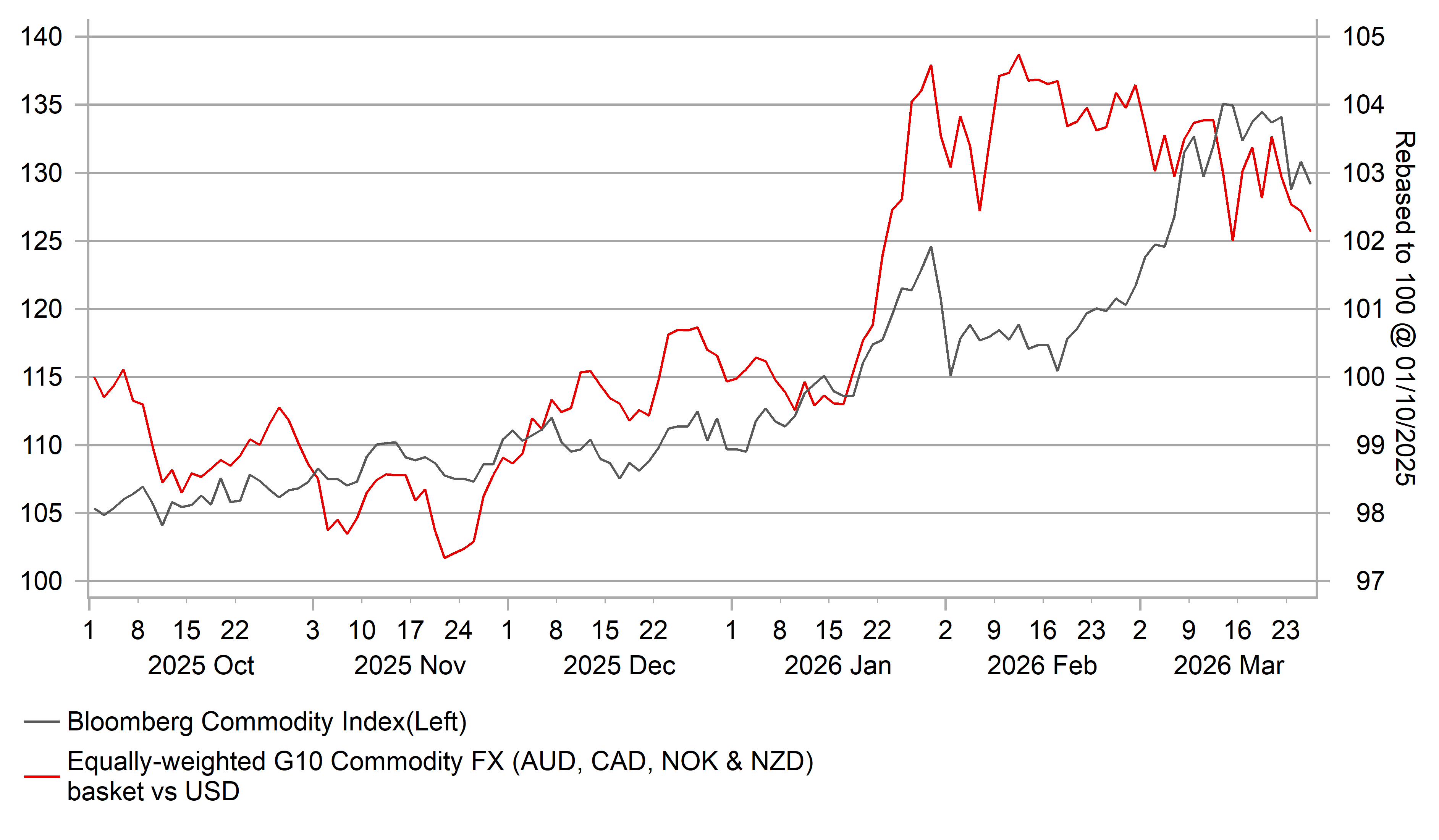 The US dollar has softened over the past week reflecting in part investor optimism over a quicker end to the conflict. The G10 commodity currencies of the Norwegian krone, Australian dollar, Canadian dollar and New Zealand dollar have all underperformed alongside the US dollar which could be an early indication that market participants are becoming more concerned over downside risks to global growth from the energy price shock. The price of copper which is viewed as an important gauge of global demand has fallen sharply over the past week to its lowest level since late last year.