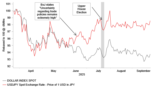 The rebound for the US dollar since last week’s FOMC meeting has been broad-based. The New Zealand dollar has weakened the most (-2.8%) against the US dollar since 16th September followed by the Scandi currencies of the Swedish krona (-1.9%) and Norwegian krone (-1.8%), and the yen (-1.6%). The yen has weakened even as the Japanese rate market has brought forward expectations for the next BoJ rate hike after last week’s BoJ policy update. There are currently around 14bps of BoJ rate hikes priced in by the end of October policy meeting and 20bps of hikes by the end of this year. It follows 2 dissents from BoJ members at last week’s meeting in favour of resuming rate hikes. The release overnight of minutes from the BoJ’s previous policy meeting in late July while dated supported building expectations for a rate hike. The minutes revealed one member thought it may be possible to end the BoJ’s wait-and-see mode by the end of this year. One member thought it would take at elast two to three months to examine the impact of US tariffs. One member thought it was important for the BoJ to raise rates in a timely manner. Heightened political uncertainty in Japan could be preventing the yen from strengthening on back of BoJ rate hike expectations.