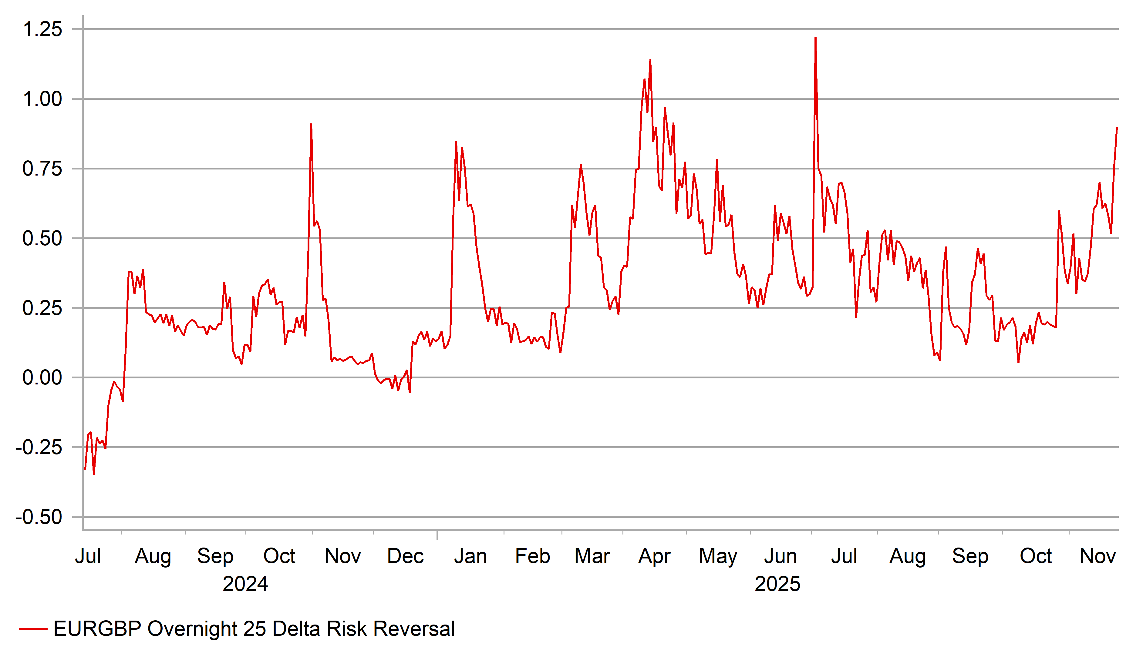 The market is now implying a 90% probability of a rate cut in December with a further 40bps of easing priced for next year. A tough credible budget that sees that extent of easing priced increasing is unlikely to be dramatic enough to weigh on the pound. Sentiment ahead of this budget has been very negative and options pricing points to a bias favouring GBP depreciation. That could mean a budget in line with expectations that doesn’t include any nasty surprises and is reasonably credible could prompt a reversal of recent market moves and GBP shorts are squeezed. The BoE GBP TWI is trading at levels not seen since January when there was a fiscal credibility sell-off after the Oct 2024 budget and suggests a level of bad news is priced into FX.