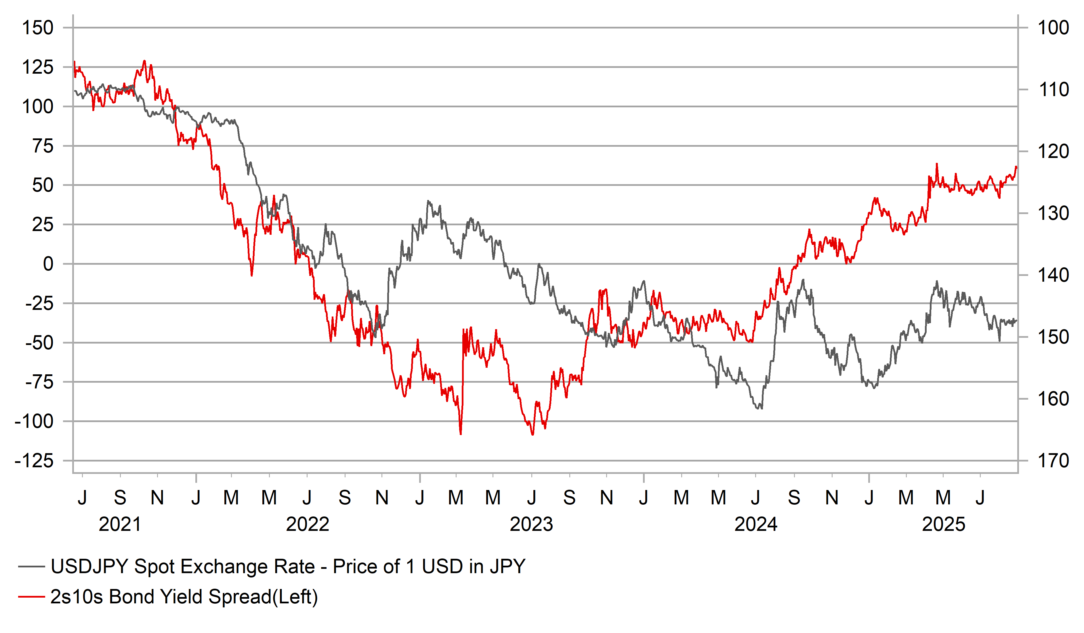 A 25bp hike in October is still only priced at a little over a 50% probability so we see plenty of scope for front-end yields to rise further. The 2-year JGB yield remains below the high set just before Liberation Day but if as we expect, the BoJ hikes in October, yields will soon be at new highs. The sharp contract in policy moves in the coming months and the uncertainty over Fed independence that continues to steepen the US yield curve all points to increasing downside risks for USD/JPY.