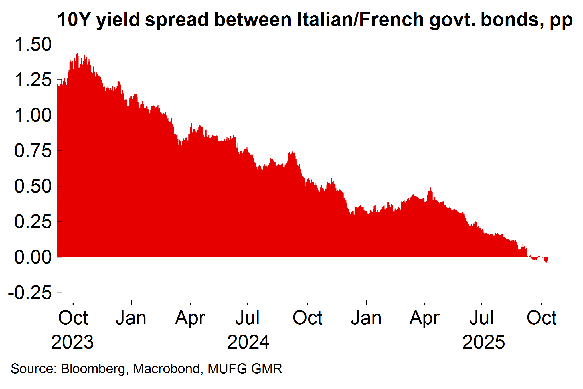 However, the initial move higher for French government borrowing costs has quickly reversed. The yields on 10-year and 30-year French government bonds are now both trading back close to levels from the end of last week prior to the resignation from Prime Minister Lecornu on Monday. The price in action in the French government bond market indicates that the upward pressure on yields earlier this week was mainly driven by building investor concerns that President Macron could call fresh elections in France. However, those concerns have since eased after reports that President Macron is likely to appoint another Prime Minister by the end of this week with a preference for a technocrat. In addition, there have been indications that the next Prime Minister would be more open to compromise on scaling back fiscal consolidation measures including discussions over reversing pension reforms. While a budget with less fiscal consolidation would be helpful for political stability, it would be a negative development for France’s fiscal outlook. Without a majority in parliament in favour of significant fiscal consolidation, the government is likely to continue running elevated budget deficits ahead of the next scheduled Presidential election in 2027 remaining a headwind for the performance of French government bonds.