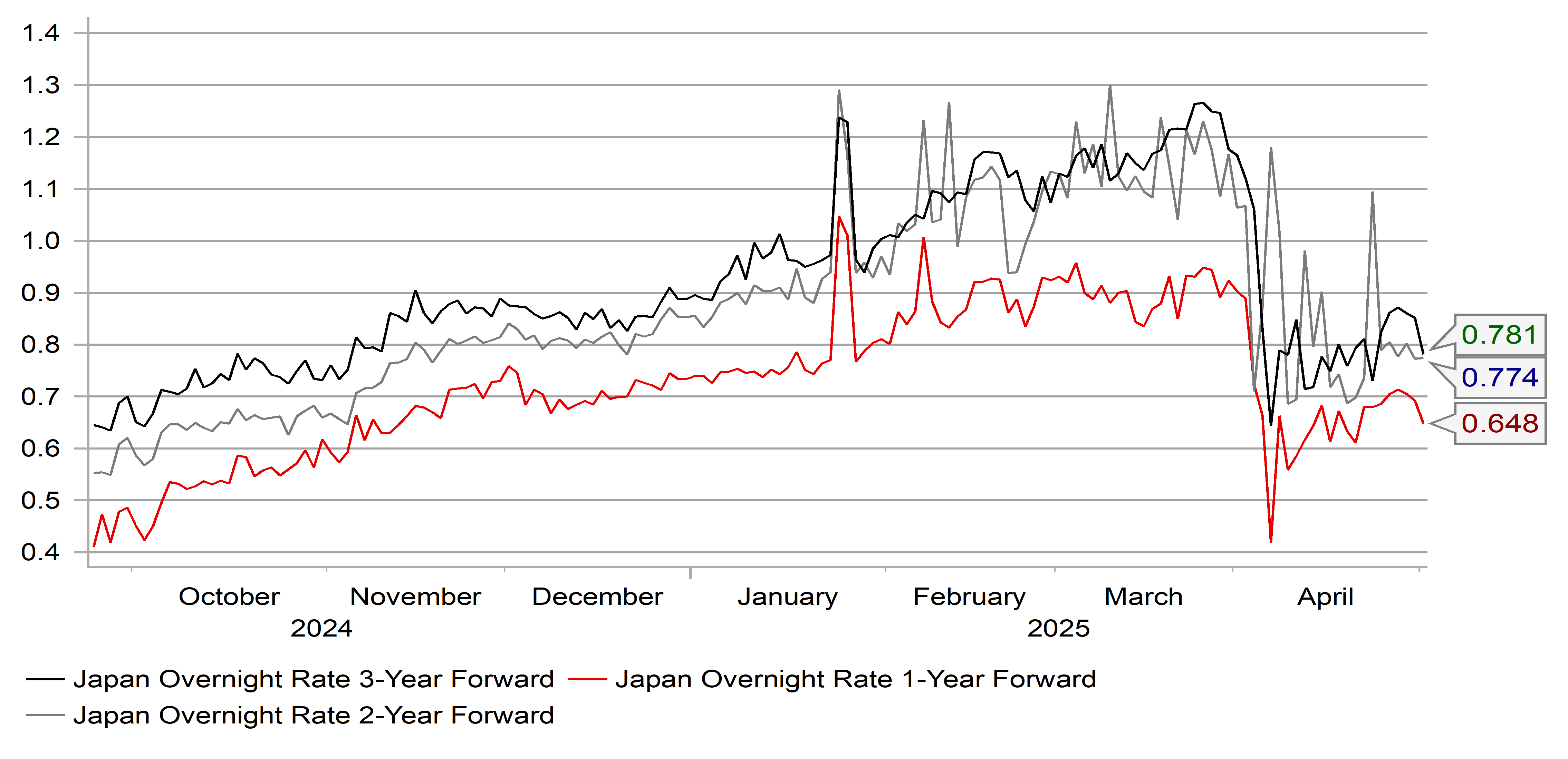 At the current juncture, the dovish repricing of BoJ expectations appears appropriate although one can’t rule out another rate hike later this year if downside risks to the economic outlook from trade disruption ease. It has been reported overnight that Japan’s chief negotiator Akazawa expressed hopes of reaching a trade agreement with the US in June following further talks with US officials this week. The next round of trade talks could come from mid-May onwards. The Nikkei newspaper has reported that Japan wants trade negotiations to be more comprehensive including a review on non-tariff barriers and expanding imports of US farm products. In contrast, the Nikkei reported that the US sought to keep talks focused on “reciprocal tariffs” and plans to maintain tariffs on autos as well as steel and aluminium. The 90-day delay for higher reciprocal tariffs is set to expire on 9th July when a 24% rate would be applied to imports from Japan up from the current 10% universal rate. Even if a trade agreement is reached in the coming months to ease the direct hit to Japan from higher tariffs, the BoJ would still be wary of the negative indirect impact from slower global growth.