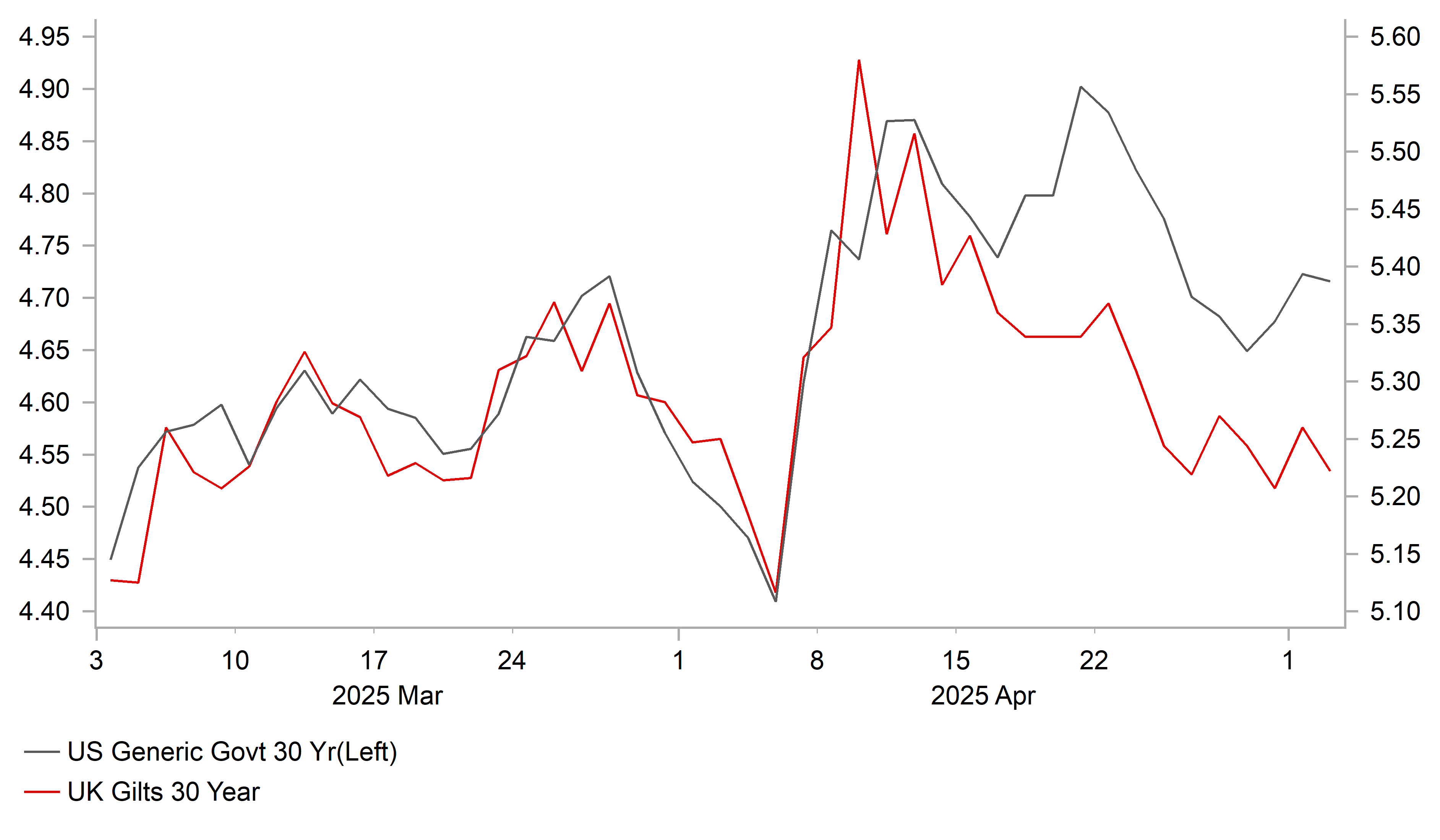 The GBP has been hit harder recently by the sharp jump in financial market volatility triggered by the initial fallout from President Trump’s tariff plans. It has triggered an unwind of carry trades that reinforced the sell-off in higher yielding currencies such as the GBP. At the same time, unfavourable external conditions have made it more challenging for countries that rely more on external financing such as the UK whose current account deficit totalled just under 3% of GDP last year. Negative sentiment towards the GBP was reinforced as well last month by the renewed sell-off in the Gilt market which was hit by negative spill-overs from the sell-off in the US Treasury market. The 30-year Gilt yield temporarily jumped by around 60bps between 7th and 9th April which was similar in size to the move higher in the 30-year US Treasury yield. After peaking at 5.66% on 9th April, the 30-year Gilt yield has since dropped back towards 5.20% alongside an easing of financial market volatility helping the GBP to rebound.