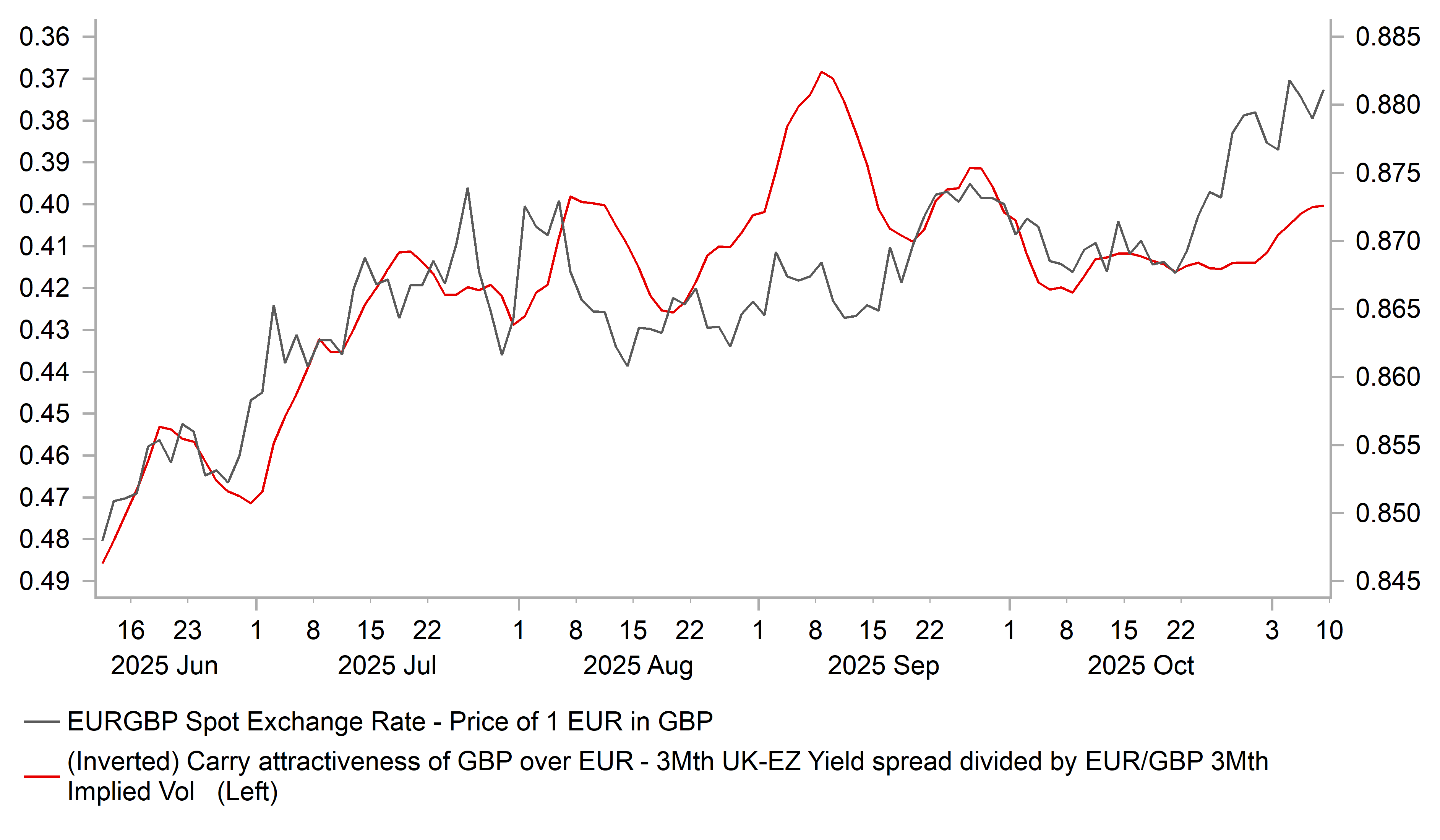 So we still see scope for this easing of dollar buying momentum turning back to dollar selling. If EUR/USD was to trade to the mid-1.16 level by end-Nov, the seasonal bias that strongly favours higher EUR/USD in December makes our 1.20-level still achievable. The OIS market shows 17bps of cuts for the December FOMC and a fed funds of 3.08% by October 2026. We see scope of that level being achieved more quickly and weak payrolls data and renewed economic uncertainty fuelled by another bout of trade uncertainty would likely see a renewed drop in US yields. The failure of dollar gains to extend after the DXY technical break this week is a bearish signal.