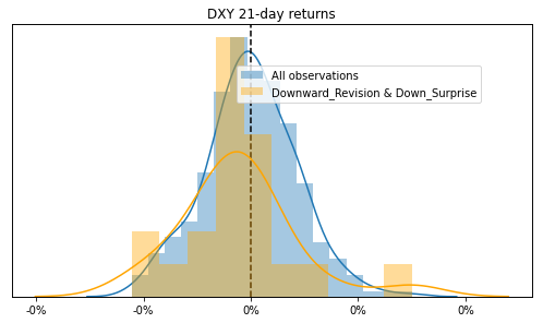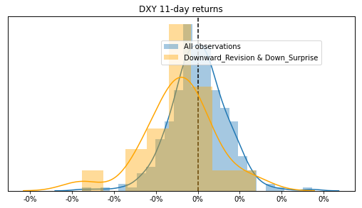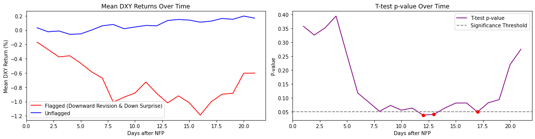 This is visually evident when examining the distribution of DXY returns over the 11-day and 21-day horizons following the flagged NFP release. The data reveals a downside bias, suggesting persistent USD weakness over the period.