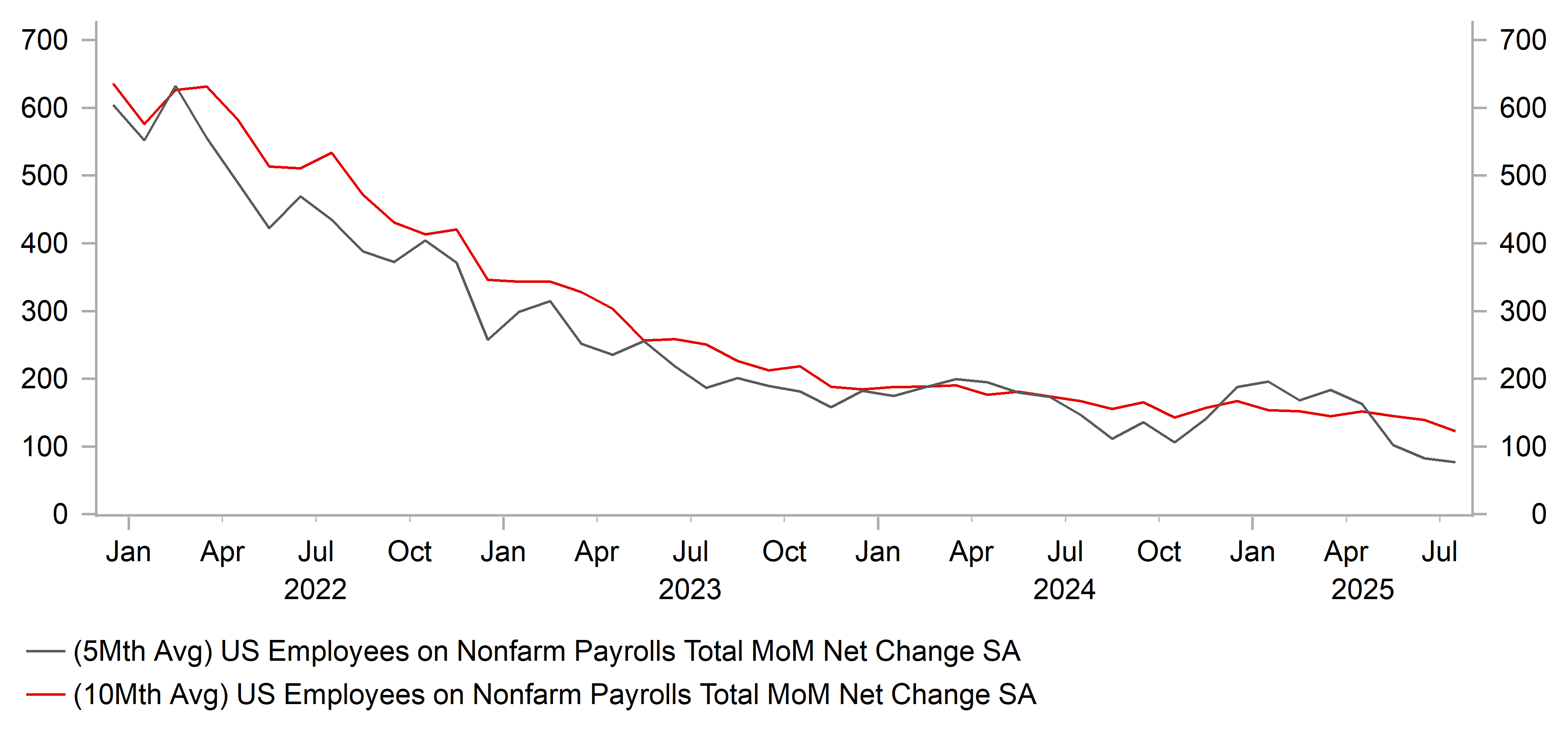 The very weak payrolls data last Friday was certainly a gamechanger in increasing notably the prospect of near-term rate cuts. The decision from Trump to nominate Stephen Miran to the Board of Governors temporarily will add to the Governors calling for rate cuts. Assuming his confirmation is quick he should be in place for the September FOMC meeting and the three following meeting through to the meeting on 28th Jan 2026. The market is nearly priced for three 25bp cuts by then which seem reasonable assuming there is no nasty shock in CPI data. Given the emerging evidence in June of a tariff impact that is still a clear risk but at this point we assume the weakness in the jobs data and the building rhetoric amongst Fed officials for a cut means a cut will be delivered in September and additional cuts beyond.