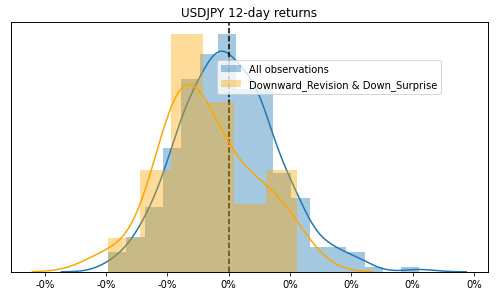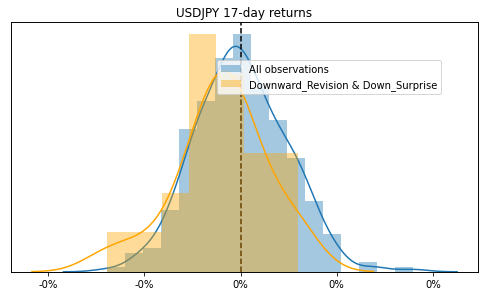 This is visually evident when examining the distribution of USDJPY returns over the 12-day and 17-day horizons following the NFP release. The data reveals a downside bias, suggesting persistent USDJPY weakness over the period. This bias remains evident up to the assessed 21-day mark.