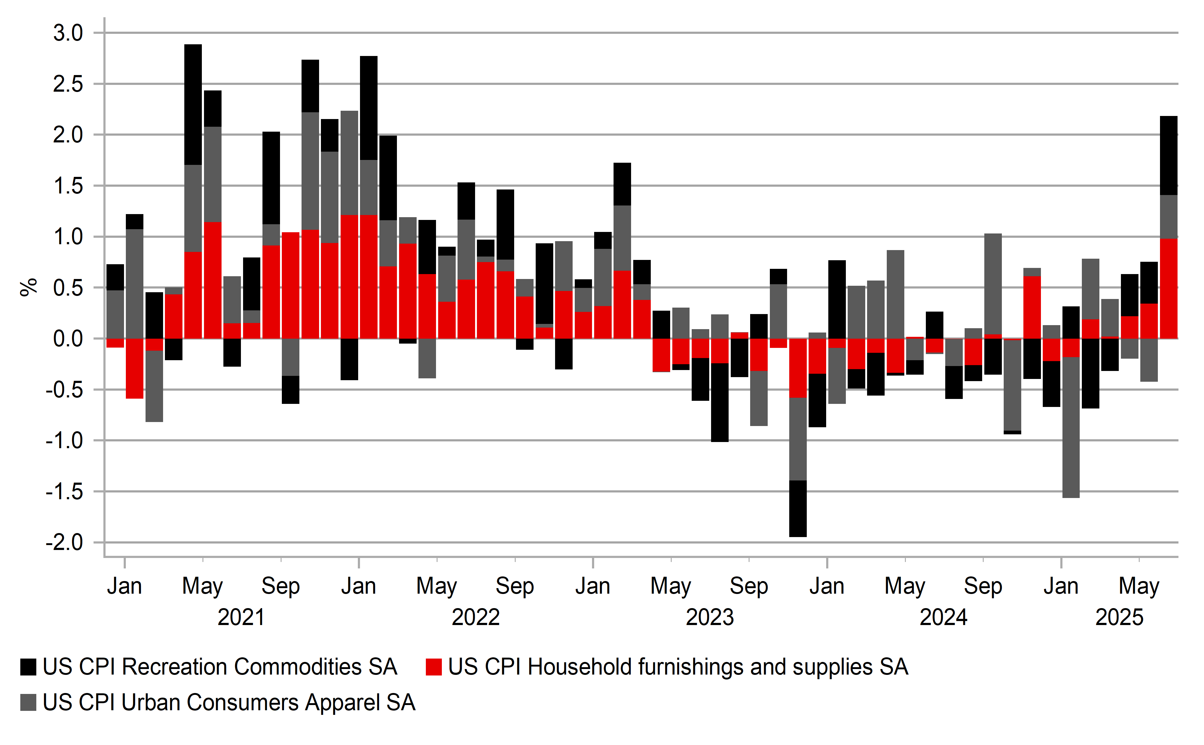 While the full impact from the latest tariffs may take time to feed through to CPI data, the CPI data next week for July will still be very important. As can be seen in the chart above, the June CPI did reveal evidence that the tariff rates already live are starting to have a bigger impact. Apparel, household furnishings, and recreation goods are three of the most import-intensive categories in CPI and when the June MoM increases are combined, the increase was the largest since January 2022 during the global inflation shock post-covid. The full scale of tariff increases are unlikely to pass to the end-consumer and Japan’s export price index for autos into North America showed a sharp drop (-20%) that points to suppliers’ margin being squeezed. But this will be more evident in goods that consumers can easily substitute and hence will differ widely. For sure, final CPI will likely show the pass-through and the June data was likely the start.