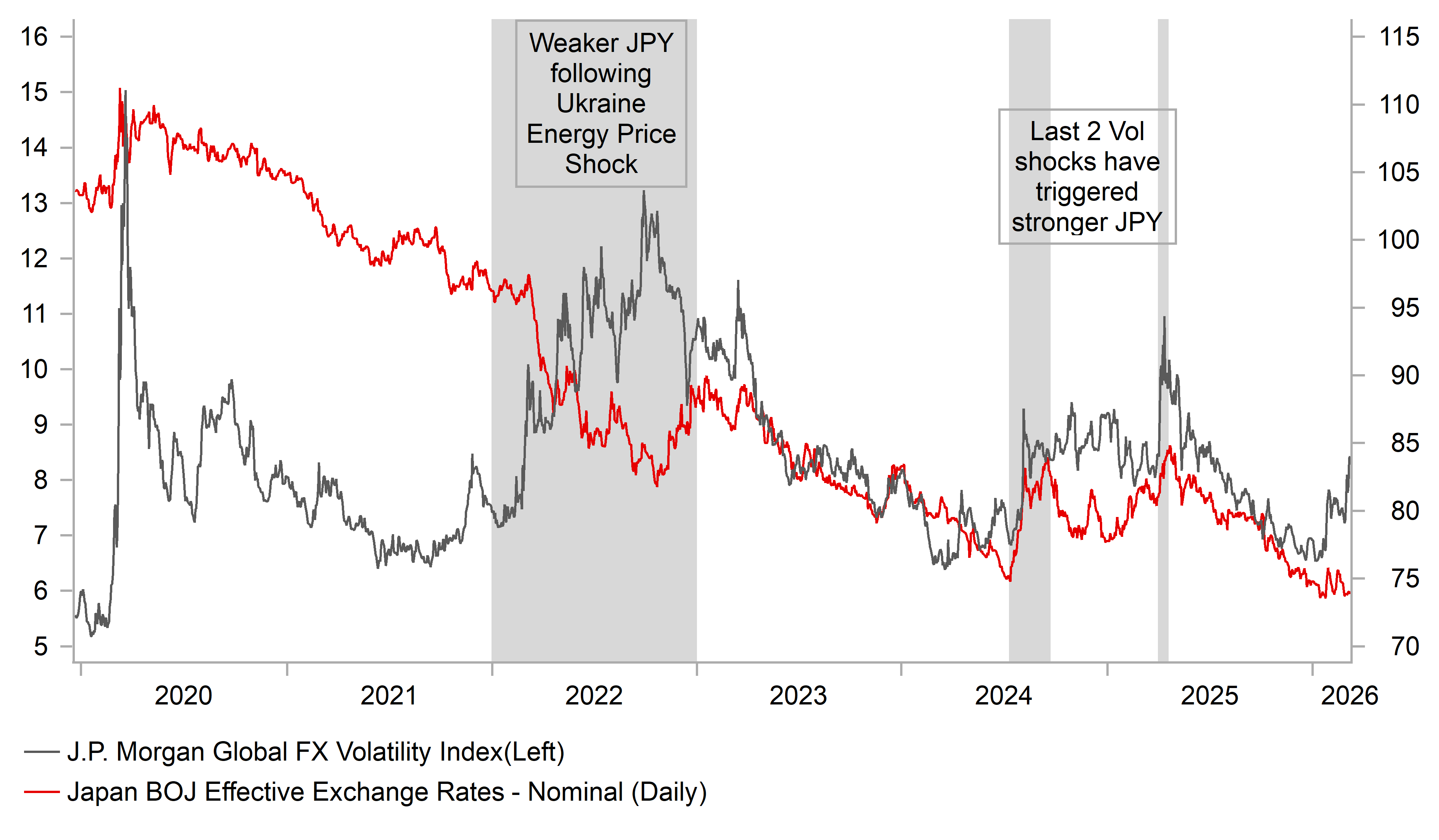 On the other hand, funding currencies such as the JPY have not rebounded. The BoJ’s trade‑weighted JPY index remains close to year‑to‑date lows. The JPY strengthened on the last two occasions when FX volatility spiked, first in April 2025 and again in the summer of 2024. This price action highlights the risk that the JPY could stage a counter trend rally if the volatility shock from the conflict in the Middle East intensifies triggered by a squeeze of JPY‑funded carry positions that have been built up since the Ukraine conflict began in 2022. During the last major energy price shock in 2022, the JPY was one of the worst‑performing G10 currencies (alongside the SEK), as Japan was hit by a sharp negative terms‑of‑trade shock and the BoJ maintained a cautious stance, keeping rates on hold while the Fed and other major central banks lifted rates away from the zero bound. This policy divergence encouraged the build-up of JPY‑funded carry trades. The trade‑weighted JPY has weakened significantly since that 2022 energy shock by around 23%, with over half of those losses occurring after market volatility peaked in April 2025 when Trump announced his Liberation Day tariffs.