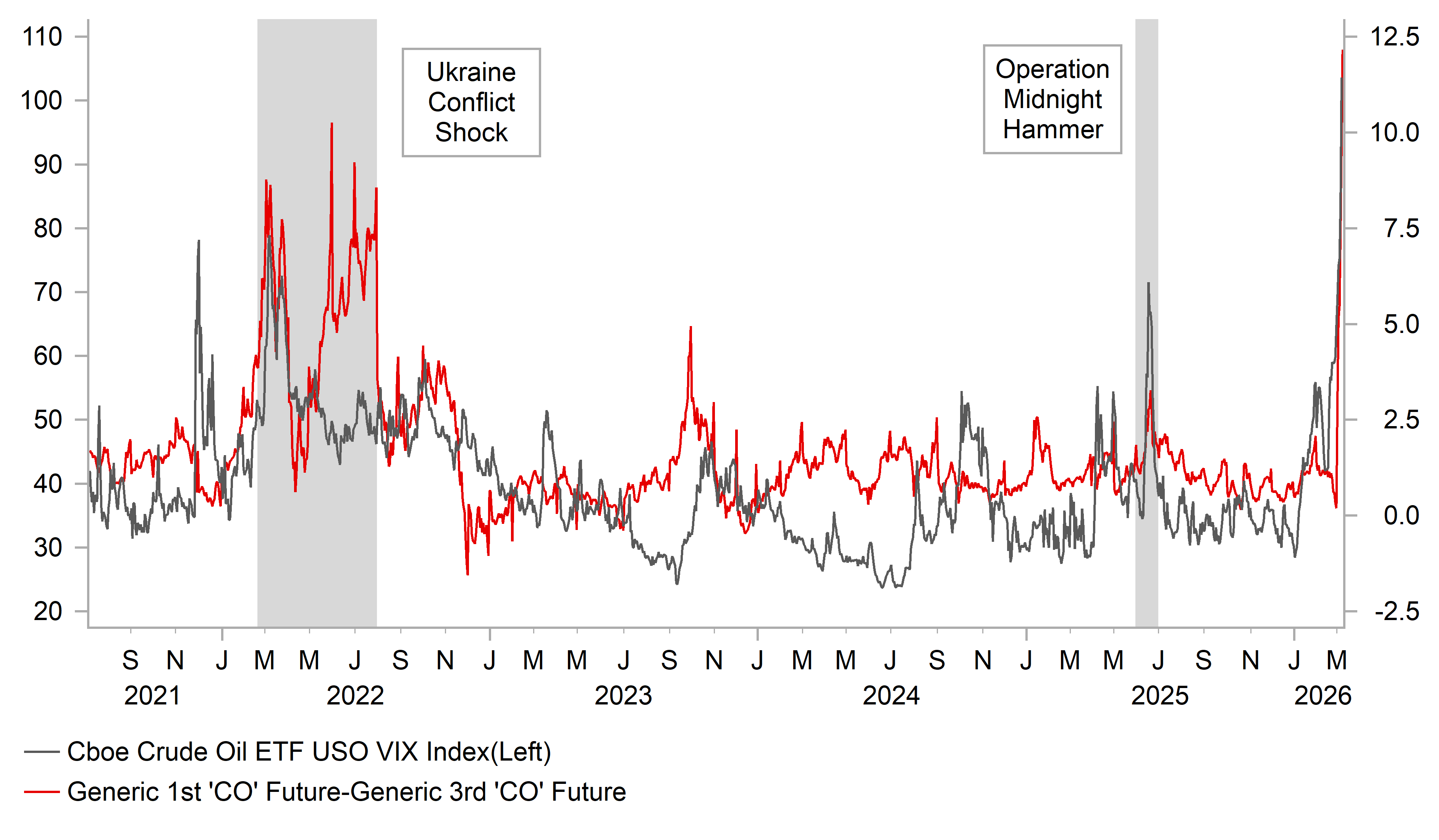 The conflict in the Middle East is delivering a volatility shock to financial markets, primarily through the channel of higher energy prices. Brent crude has surged higher by around 50%. A move that is more than double in scale to the jump in oil prices following the US–Israeli strikes on Iran in June 2025. Operation “Midnight Hammer” proved relatively short‑lived, resulting in limited disruption to global oil supply, and the spike in prices reversed quickly within a couple of weeks. In contrast, market participants are now much more concerned about the risk of greater disruption to global energy supplies. These upside risks are also visible in measures of backwardation in the oil market: the front‑month Brent futures contract is trading at its largest premium over the three‑month contract over the last forty years. At the same time, oil‑market volatility has jumped to its highest level since Q2 2020, when the initial COVID shock hit markets. The longer the conflict drags on, the higher the risk of an even larger and more disruptive oil price spike. It has reportedly prompted G7 members to consider announcing today a joint release of oil reserves potentially totalling between 300 million to 400 millions barrels. That would offset around 2 to 3 weeks of normal Strait of Hormuz flows if it remains effectively closed.