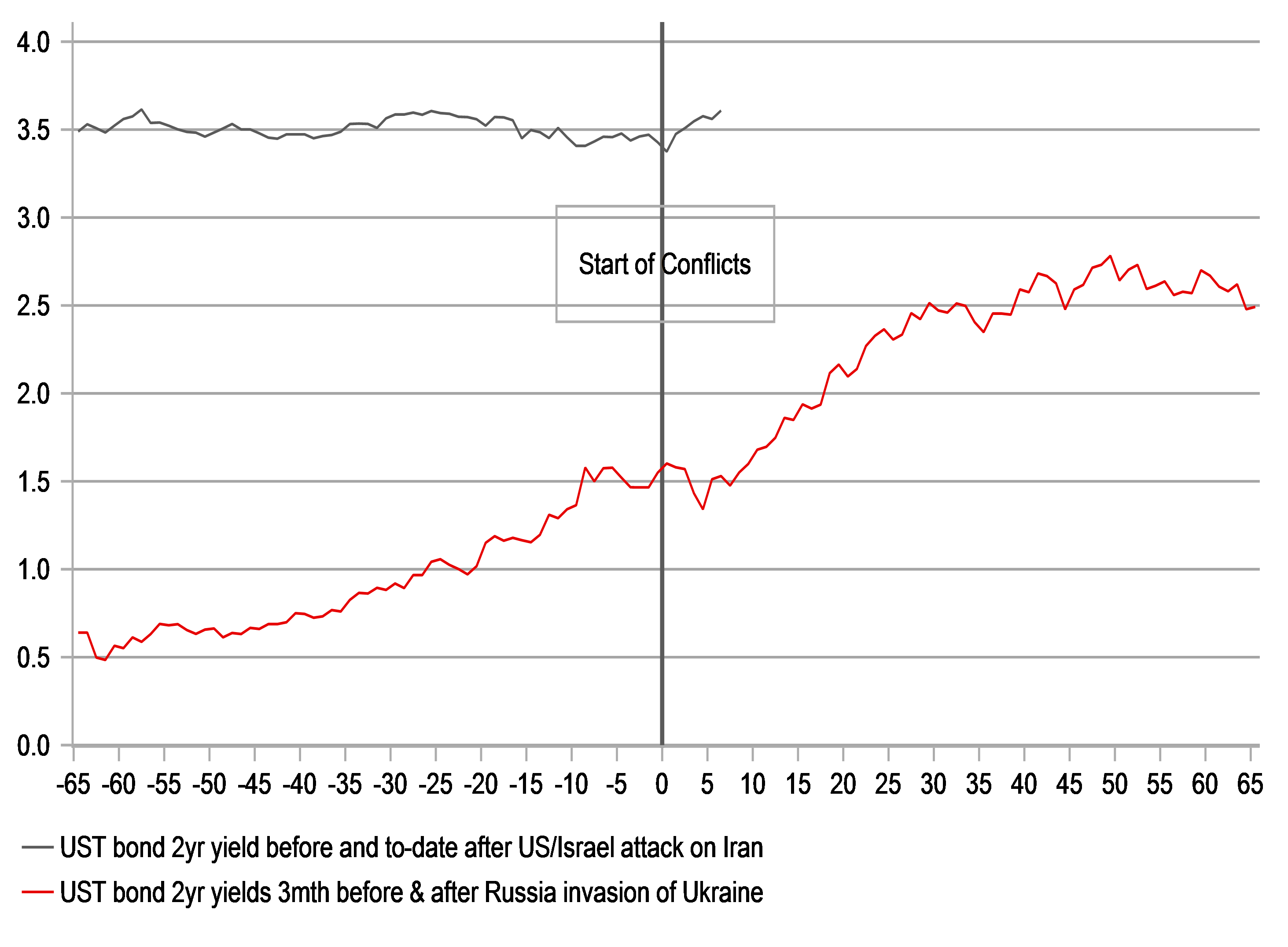 We are in the very early stages of the US-Iran conflict and the financial market moves have been relatively contained outside of energy, perhaps reflecting the scale of unknowns and uncertainties in regard to the scale of this conflict. Investors may not want to yet price a bad scenario given the unpredictability of President Trump and his capacity to suddenly change tack, by perhaps seeking an off-ramp to de-escalate more quickly than expected. One similarity between this conflict and the Russia invasion of Ukraine is that investors were not completely taken by surprise. There had been a build-up of Russian troops for months ahead of the invasion just like now there has been a steady build-up of US military in the Middle East. Hence, investors had been pricing the risk of a conflict well before the start and the crude oil chart below indicates a similar performance for crude oil in the months leading up to the start of the conflicts and the very early initial reactions. As it became clearer that Russian crude supplies would be sanctioned and that Russia would use natural gas as a weapon energy prices then surged. The deterioration in supply expectations over the weekend has now seen the crude oil price surge surpass the 2022 episode and this along with the surge in short-term rates in Europe means this will quickly translate to a growth shock.
