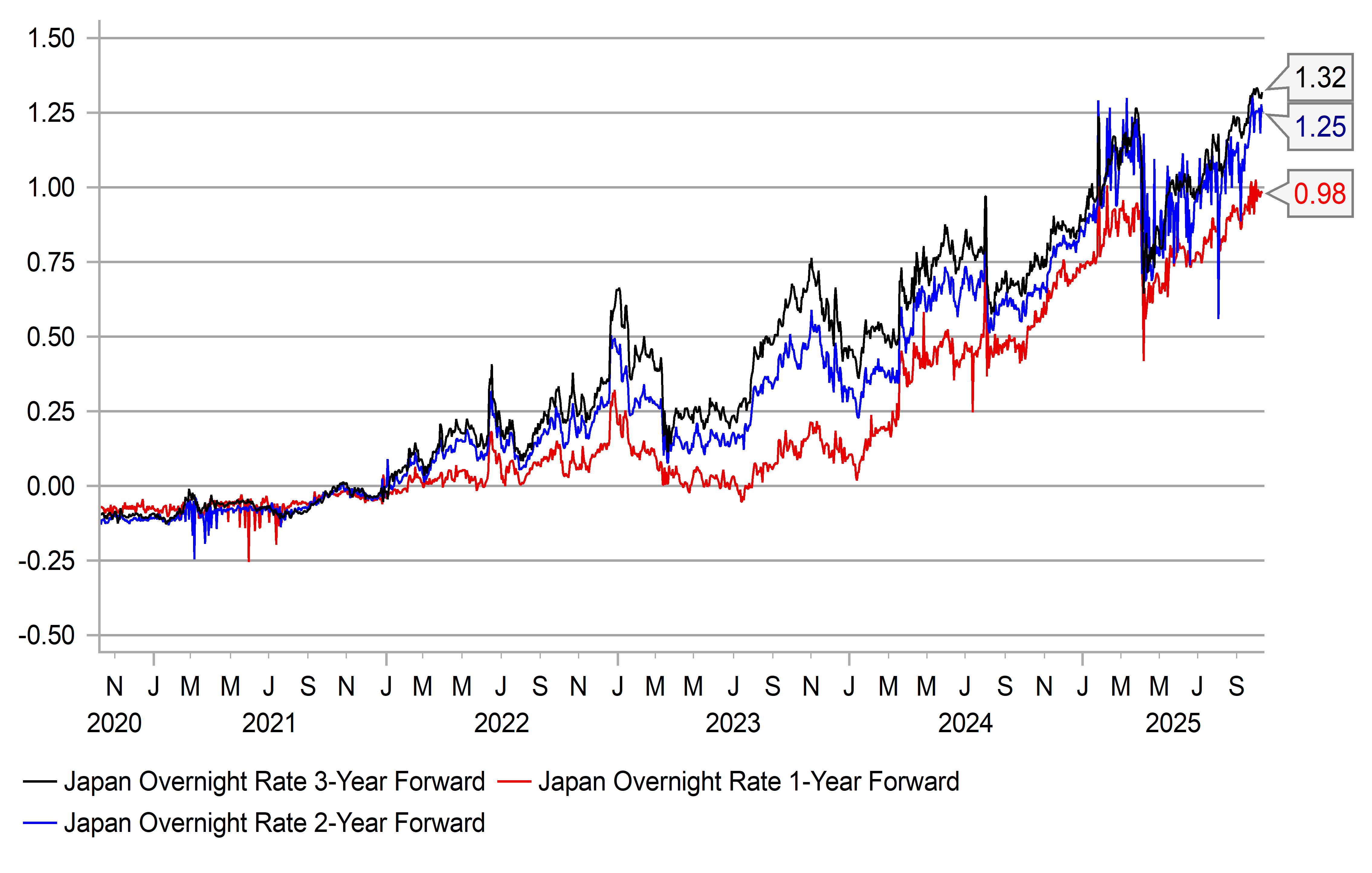 The yen has plunged this week and is by some distance the worst performing currency not just in G10 but globally after the surprise victory for Sanae Takaichi in the LDP leadership election last weekend. The scale of yen selling on Takaichi’s win has helped curtail further selling after New Komeito’s departure from its long-standing coalition with the LDP (26yrs). How the LDP governs going forward is now likely to prove even more difficult with the prospect of a wider coalition now less likely. New Komeito could reverse its decision and Takaichi has indicated further talks will take place next week. A minority government appears most likely at this stage which may curtail Takaichi’s ability to adopt policies that have been linked to yen selling. With the government shutdown set to persist and the Fed set to continue cutting rates, we argue there are limits to the upside for USD/JPY. Gold remains one of the best performing assets this year and in this gold-supportive environment we would expect the Swiss franc to remain an attractive FX alternative.
