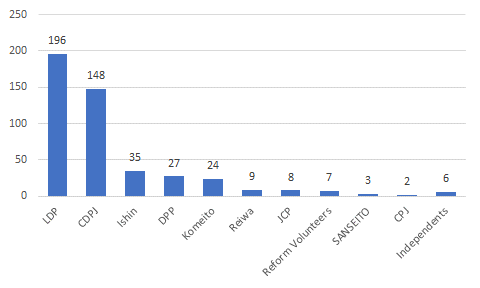 The LDP currently hold 196 seats in the lower house of the Diet and New Komeito holds 24 seats out of 465 seas in total. So under the coalition the government were 13 seats short of a majority. The other two large parties (apart from the Constitutional Democratic Party of Japan, the main opposition with 148 seats) are the Japan Innovation Party (Ishin; 35 seats) and the Democratic Party for the People (DPP; 27). There are five other smaller parties and six independents that in total hold a further 35 seats. Based on these numbers we see four possible scenarios. (1) The LDP relents and agrees to New Komeito demands on stricter rules on political party funding, the coalition is revived and the DPP comes into the coalition to create a working majority coalition government; (2) The LDP alone without any formal coalition agreements governs as a minority with informal support from New Komeito and other parties; (3) Given the numbers the LDP seeks a coalition agreement with Ishin and the DPP to form a working majority; (4) The CDPJ seeks the support of numerous opposition parties to put forward its own candidate for prime minister and governs under broader informal agreements with other opposition parties to form a functioning government.