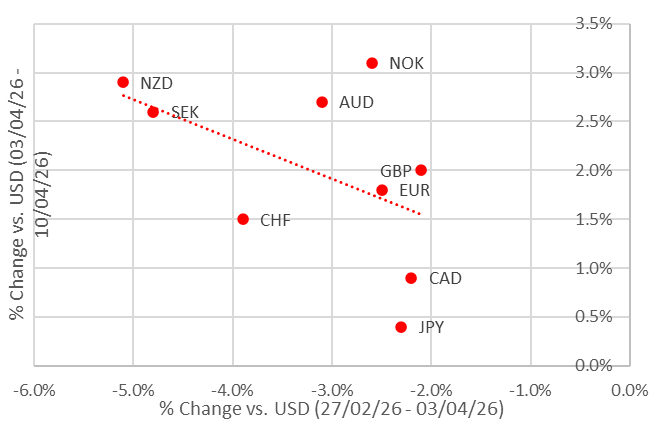 The USD has corrected lower over the past week, driven by a de‑escalation of the Middle East conflict following the agreement between the US and Iran on a temporary two‑week ceasefire. The USD remains at weaker levels even after negotiations between the US and Iran failed over the weekend. The main beneficiaries among G10 currencies have been the high‑beta commodity currencies of the NOK, NZD and AUD alongside the other Scandinavian currency of the SEK. All four had underperformed since the onset of the conflict, with NZD and SEK particularly hard hit, having fallen by around 5% against the USD. Similar reversal dynamics have also been evident across emerging market currencies. The HUF, ZAR, MXN and CLP have all outperformed over the past week, supported by the temporary ceasefire, after weakening more than most other EM currencies earlier in the Middle East conflict.
