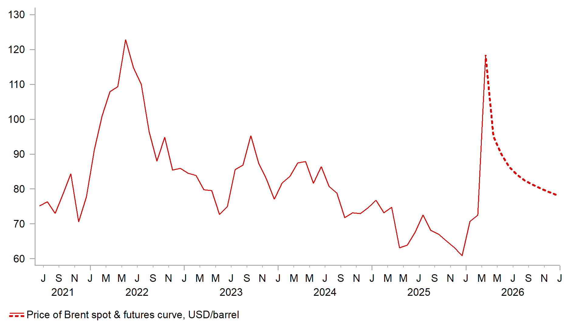 Three scenarios were laid out in the earlier part of the conflict were published in an earlier FX Weekly (here) and the crude oil price that has traded around the USD 100pbl, in a rough range of USD 110-90pbl since 12th March is consistent with our original Scenario 2. Our original best-case Scenario 1 (quick de-escalation and crude back to USD 75-80pbl) is long gone and really going forward we now see two plausible scenarios. An updated Scenario 1 would see the current ceasefire hold with no clear re-escalation back into intense conflict. In this scenario the Strait of Hormuz would gradually see tanker traffic volumes pick up but with uncertainties high crude oil prices remain elevated throughout this quarter, roughly in the current range before starting to retrace lower in the Q3 and Q4 on an assumption of some sort of resolution by then. One key difference in our assumption going forward this time is that the retracement in crude oil prices takes longer and we do not retrace back to the pre-conflict level of around USD 70pbl. Production facilities in the Middle East have been damaged and the regime in Iran looks set to remain in power and hence we must assume a less favourable outlook for the return of pre-conflict energy supply.