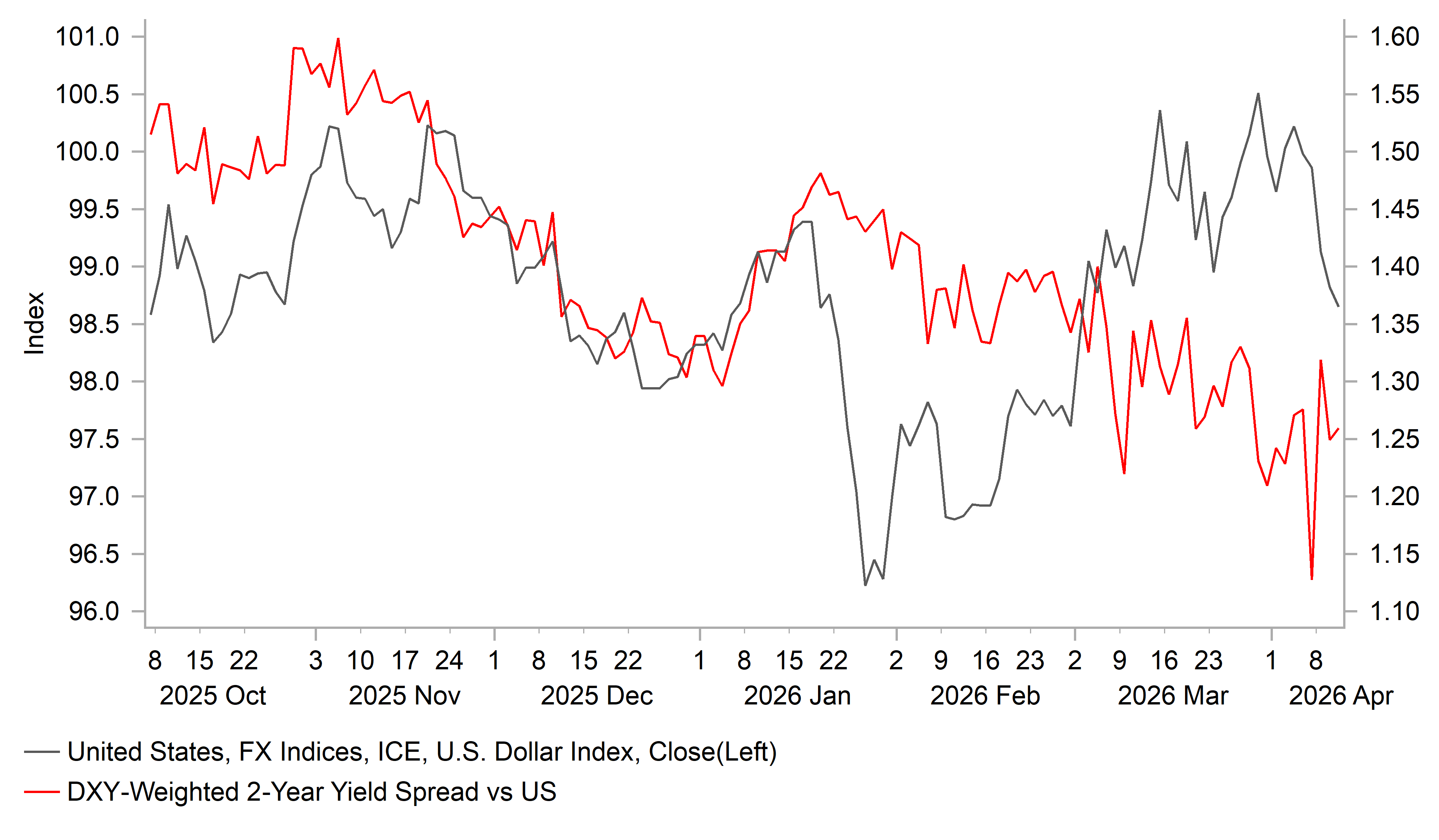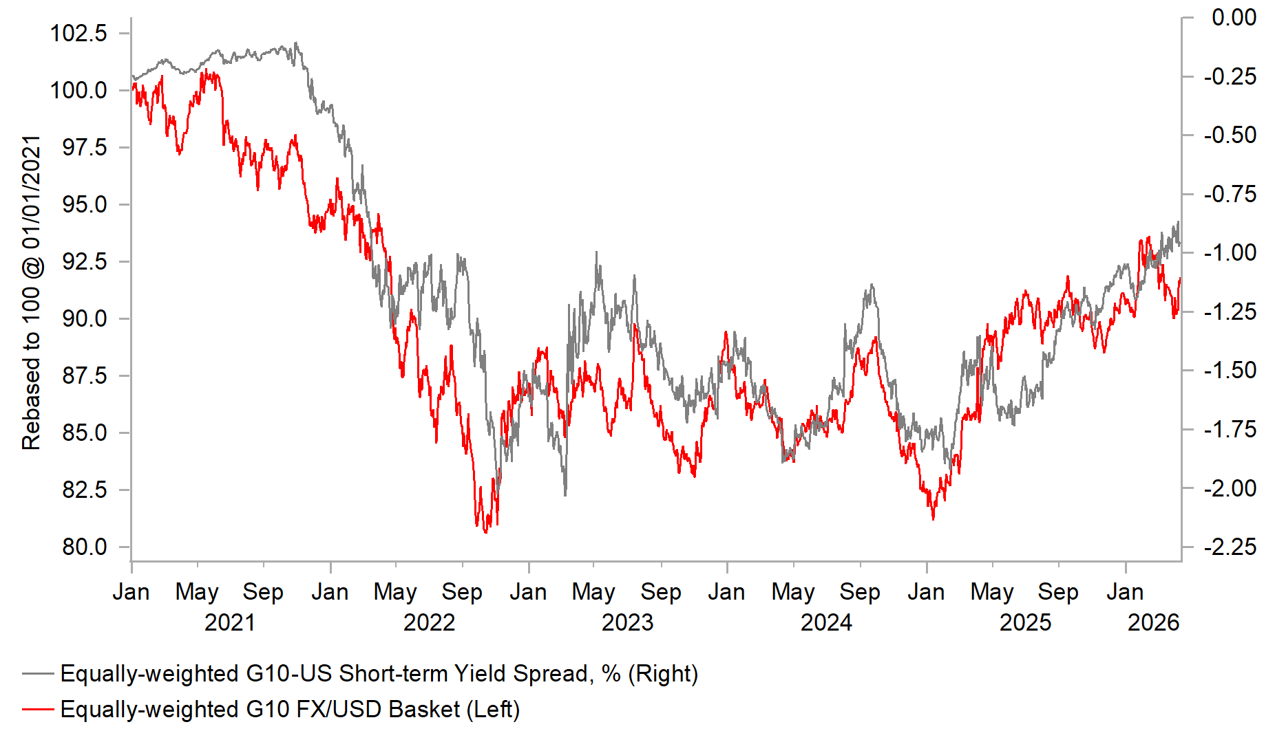 After of six weeks of conflict to the point of the ceasefire, it is clear that the US dollar has underperformed our expectations based on our original expected moves. Based on a 40%ish move higher in crude oil prices we would have expected to see a EUR/USD drop of 3% or so. The EUR/USD rate is currently 1.0% lower. The change in swap spreads against the dollar and the lack of risk-off trading conditions have helped contribute to that. Under our new Scenario 1 of crude remaining around current levels before slowly retracing from Q3 onwards, we would expect to see EUR/USD trade around current levels to lower before moving higher in the second half of the year. Our current Q1 2027 forecast is 1.2000 and given the more modest gains for the dollar that forecast could now be too low. The only scope for a notable gain for the dollar would be if we saw a period strong risk-off on global recession being priced that would result in a big decline in global equities of around 20%. That’s still a considerable risk and as time passes the impact of the supply disruption will become more evident. The US dollar would appreciate with high-beta G10 suffering most. The Swiss franc and yen could perform best as front-end yields in the US fall.