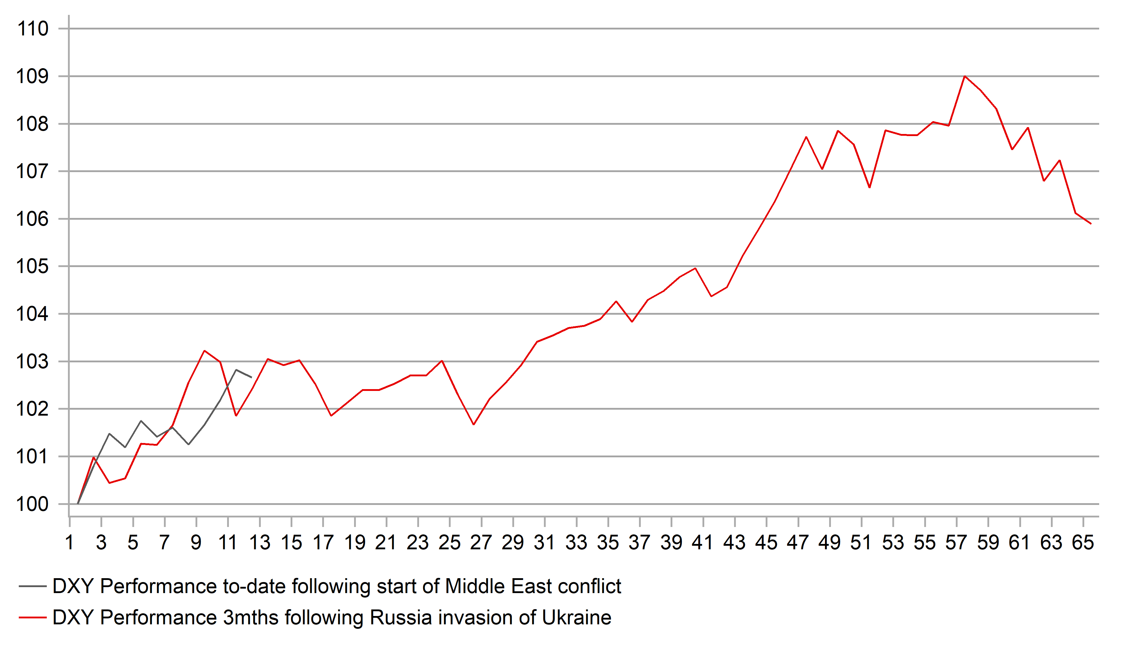 Higher energy prices, combined with still‑soft labour‑market conditions, create a more challenging backdrop for the Fed as it seeks to balance its dual mandate of maximum employment and price stability. With policy rates judged to be mildly restrictive, the Fed is not under the same pressure to raise rates as it was in 2022. Following the start of the Ukraine conflict in February 2022, the Fed began tightening in March and ultimately lifted rates by a total of 4.25 percentage points by year end. It was one of the key reasons the USD strengthened sharply by roughly 20% over that period alongside the bigger hit to economies outside of the US from energy price shock.