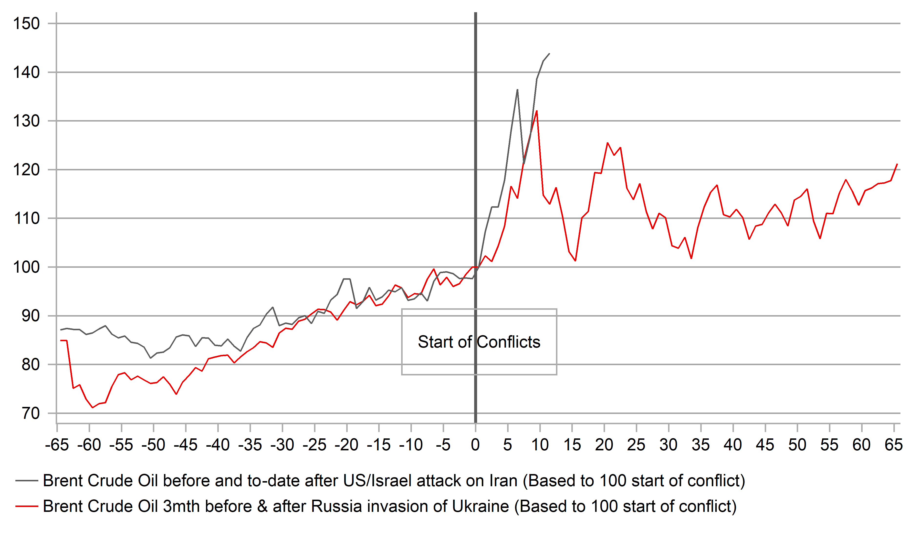 The length the conflict will be closely tied to the potential severity and hence timelines are important in laying out these scenarios. Scenario 1 is the best case scenario that perhaps investors continue to hold out hope for. This would essentially see de-escalation materialise relatively quickly certainly now with the conflict over two weeks old, de-escalation is over the next week, to ten days, to two weeks max. There is a compelling logic to this still potentially happening with President Trump likely to face increasing pressure domestically if energy prices continue to rise and if the US suffers further loss of lives. With the mid-term elections in November, a renewed rise in gasoline prices and grocery prices that stick for longer would be hugely damaging to the prospects for the Republicans in November. According to the US Central Command (CENTCOM) the US has struck 6,000 Iranian targets since the war began. With the supreme leader and many family members killed and the new supreme leader reportedly badly injured, President Trump could at some stage soon claim victory and move to de-escalate. In Scenario 1 we would see Brent crude oil in a range of USD 75-85 p/bl, which assume a risk premium of USD 10 p/bl is in the price for some time. The US dollar could weaken back modestly with EUR/USD in a 1.16-1.18 range.