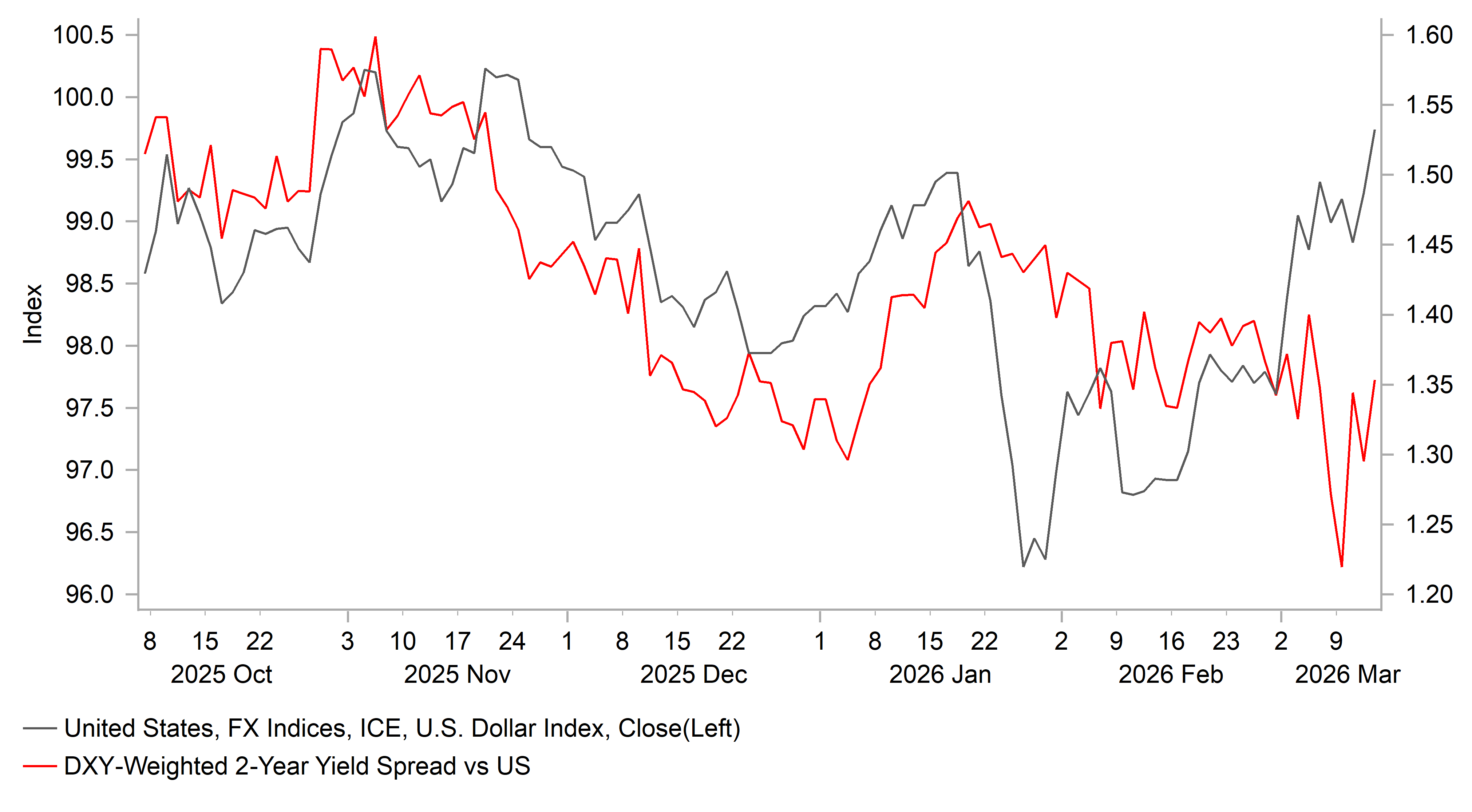 We have passed the two-week mark since the start of the conflict in the Middle East and there is no obvious reason for optimism at this stage. The US and Israel have maintained a high level of intensity in attacks on Iran but at the same time Iran has been in a position to maintain a steady rate of retaliation and more significantly has been able to ensure the continued closure of the Strait of Hormuz. DXY has broken through the key 100-level with crude oil prices elevated at around USD 105 p/bl. DXY has traded largely in a 96.000-100.00 range since June last year so this break higher could prove significant and reinforce positive momentum this week. The conflict is of course difficult to predict and hence in these circumstances laying out plausible scenarios and what these scenarios would mean for crude oil prices and the US dollar is a sensible approach. We lay our three plausible scenarios below and what is clear from these is that the risks are clearly skewed to further US dollar strength from here. How equity markets perform will also be important in determining the reaction function of central banks to the clear upside inflation risks that lie ahead. We continue to run a short EUR/USD trade view based on the risk skew of further US dollar gains over the coming weeks.