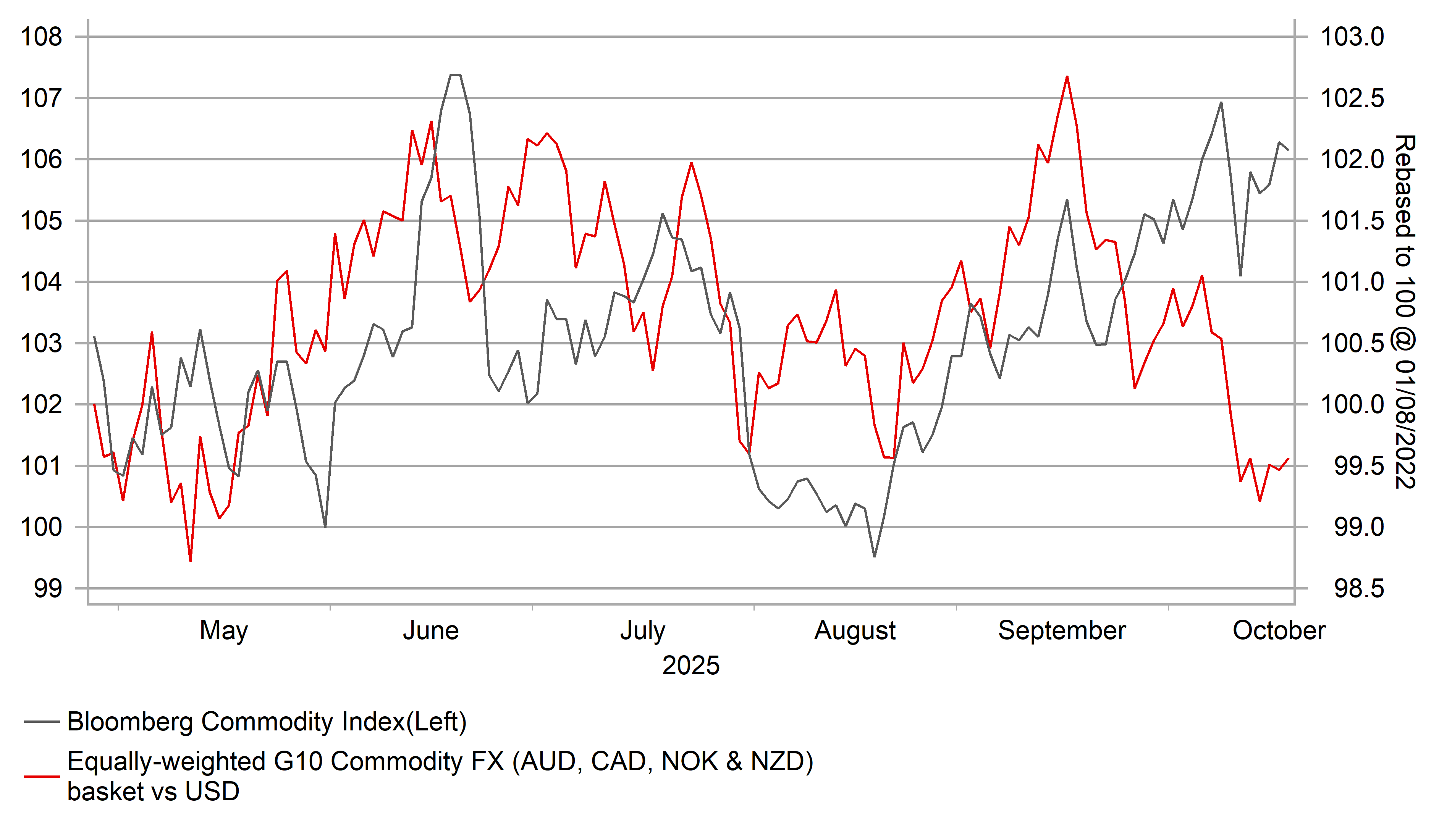 The USD has quickly given back most of the gains recorded in the prior week. The failure to extend its advance over the past week reinforces our view that the USD remains in consolidation phase in the near-term at much weaker levels after the sharp sell-off during 1H of this year. The reduction in political uncertainty in France has helped to provide support for the EUR making it more difficult to break below important support between 1.1500 and 1.1600. Similarly in Japan, initial market optimism over a bigger shift in policy under new LDP leader Takaichi has been dampened encouraging the JPY to rebound from much weaker levels. Political uncertainty in Japan is set to ease further in the week ahead when the Diet votes on the new prime minister. At the same time, trade policy risk has come back into focus for the FX market. US-China trade relations have moved back into an escalation phase after President Trump threatened to raise tariffs back above 100%. It has contributed to G10 commodity currencies underperforming although downside has been curtailed by cautious optimism that much higher tariffs are unlikely to be in place for long if implemented.