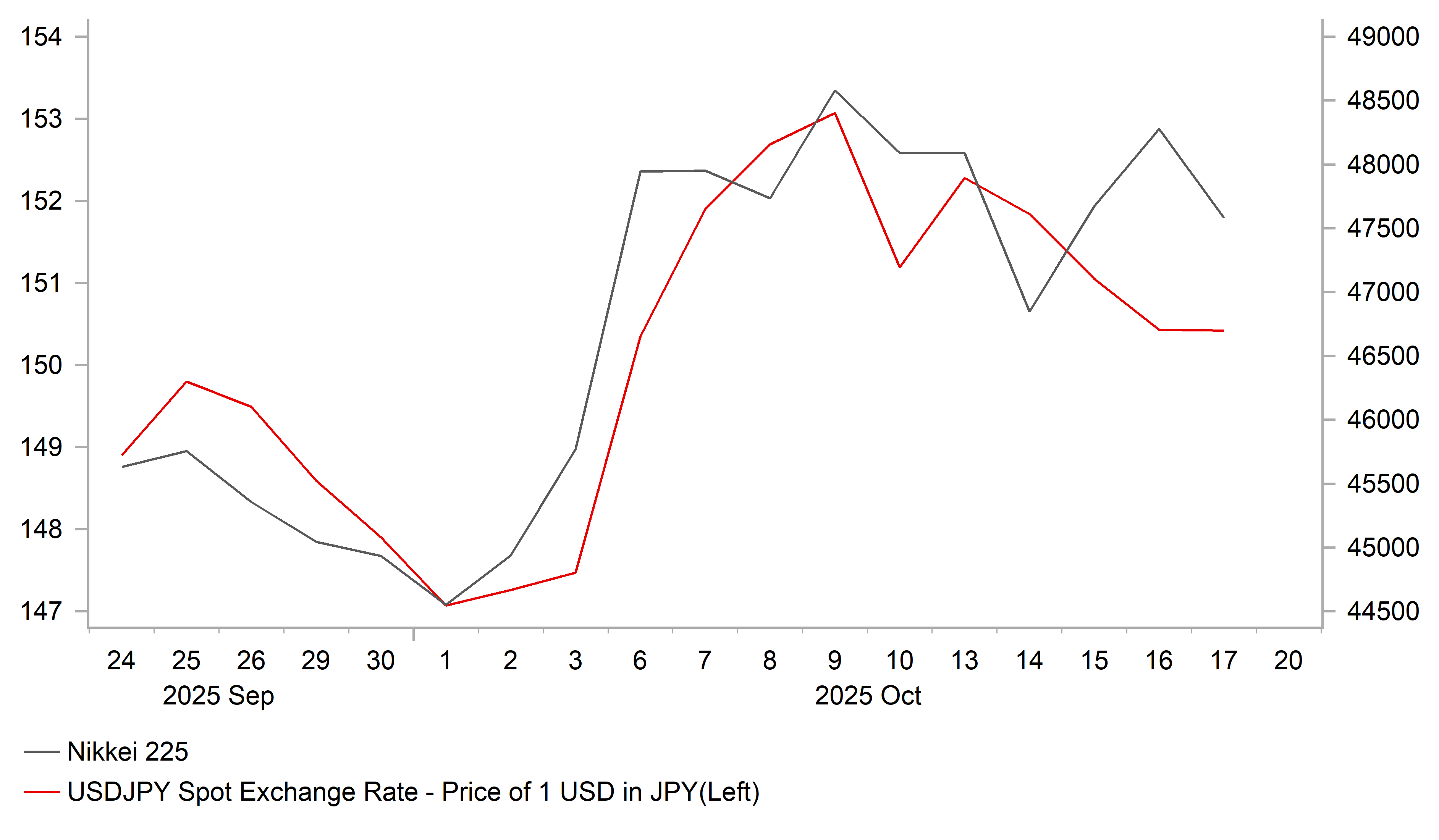 Sanae Takaichi remains likely to be voted as Japan’s next prime minister after holding talks with the Japan Innovation Party. While it is not a done deal there is a higher hurdle for the three main opposition parties including the Japan Innovation Party to join together and put forward an alternative candidate to be prime minister. Democratic Party for the People leader Yuichiro Tamaki is viewed as most likely alternative candidate to become the next prime minster. If Takaichi becomes prime minster as expected it could trigger some initial JPY selling but with only support from the Japan Innovation Party and still lacking a majority in the Diet, it will be challenging to push through much looser fiscal policy. So over time we expect disappointment to creep in and for the JPY to rebound further (click here). The worst case scenario for the JPY would be if the DPFP were to support the LDP as well given they are stronger supporters of looser fiscal policy.