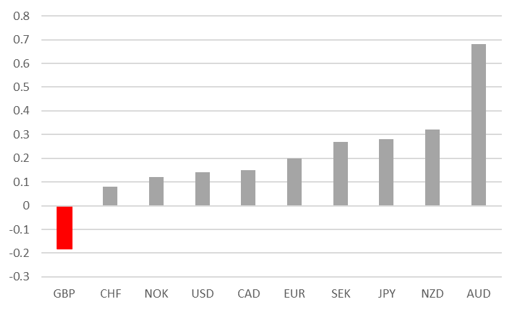 At the same time, the AUD has benefited from a hawkish repricing of RBA policy expectations. Short‑term yields in Australia have seen an outsized move to the upside over the past three months compared with other G10 economies. The 2‑year Australian government bond yield has risen by almost 70bps, versus an average increase of around 20bps elsewhere in the G10. This shift has reinforced the AUD’s status as a high‑yielding G10 currency and strengthened its carry appeal. The main exception has been the UK, where short‑term yields have fallen by roughly 20bps. The widening yield differential between Australia and the UK continues to support our long AUD/GBP trade recommendation.