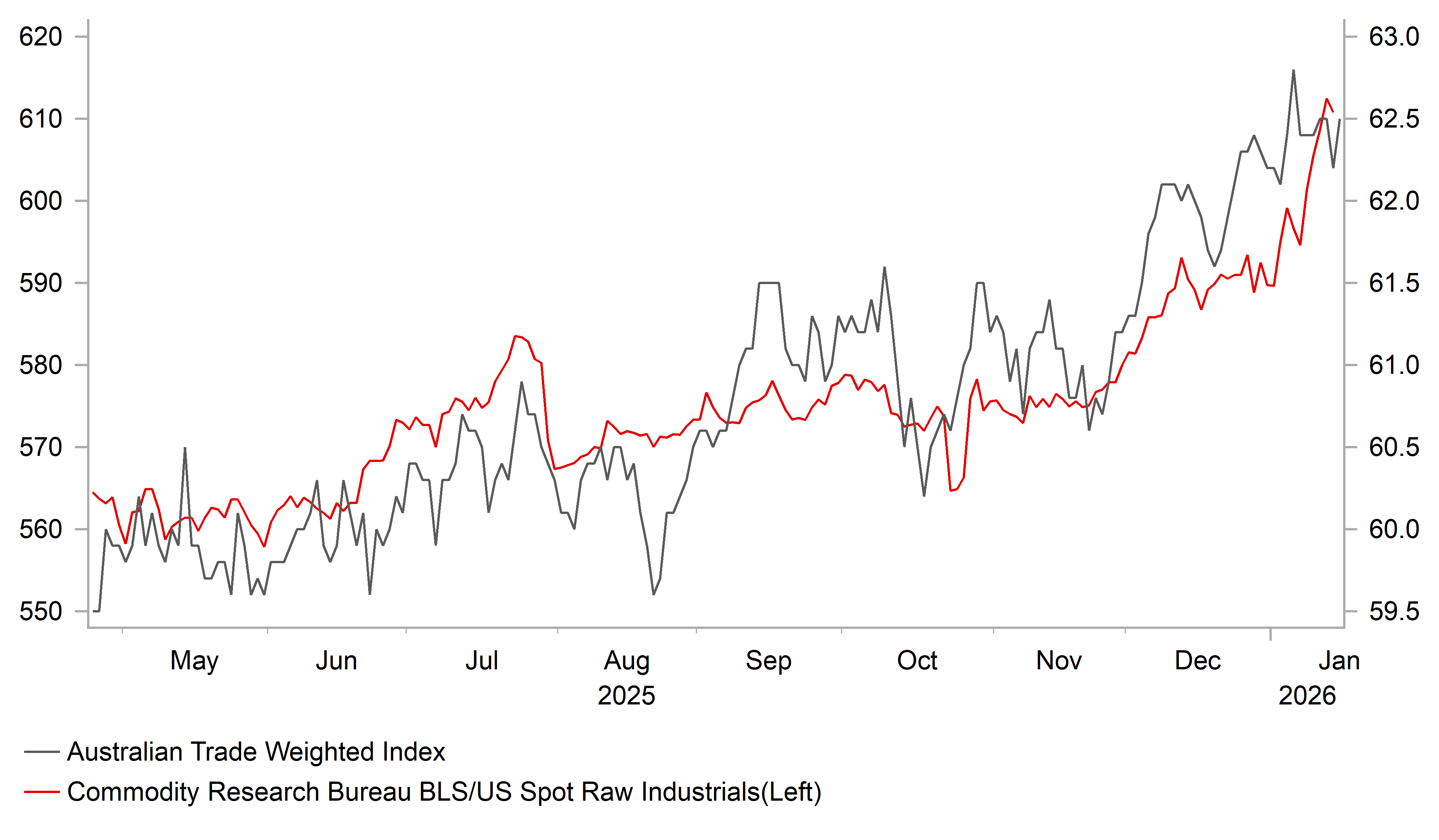 In recent months, the global economy has experienced its strongest run of positive economic surprises since the first half of 2024. This has provided further reassurance that global activity is proving more resilient than expected to the trade disruptions triggered by President Trump’s tariffs. At the same time, investors remain optimistic that the AI boom, together with looser fiscal and monetary policies and an ongoing easing in financial conditions, will deliver additional support for global growth in 2026. The stronger‑than‑expected run of global economic data has also coincided with a bullish breakout in global commodity prices. The CRB Raw Industrials Index has climbed sharply—by around 6.5% since late November—helping to improve Australia’s terms of trade and supporting a stronger AUD.