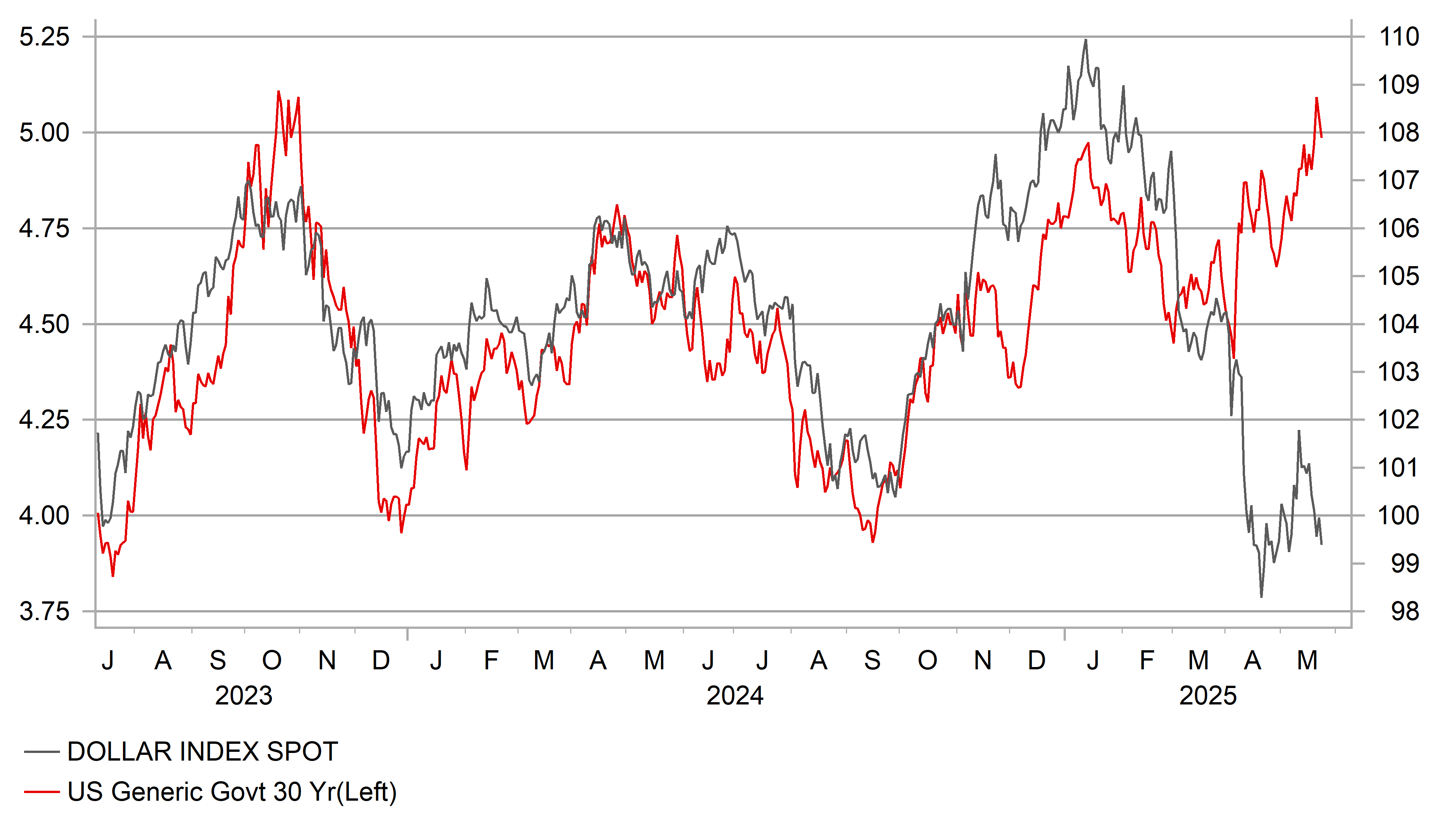 The JGB move can’t be viewed in isolation and of course the deterioration in UST bond sentiment was certainly part of the driver. The rolling correlation chart below highlights the current degree of correlation – relatively strong still, but has been stronger. One Japan-specific factor was likely the decision of the BoJ to alter its JGB buying plan for Q2 that was announced at the end of March. For the first time in a year, the BoJ cut its buying of super-long JGBs, from JPY 450bn per month to JPY 405bn. There have also been communications from the BoJ that suggests the BoJ is currently indifferent to the rise in long-term yields. Policy board member Asahi Noguchi, a known dove, saw no link between the BoJ’s balance sheet policy and rise in yields and implied the move would not prompt the BoJ to change tack. Governor Ueda, in Canada, refrained from discussing short-term moves in yields. Governor Ueda has stated that one of his primary goals is to normalise the BoJ’s monetary policy framework and return to the global standard of using short-term rates to adjust policy. Hence, the BoJ will be very reluctant to give any impression of a return to a policy that could be viewed as akin to YCC. We therefore do not expect any notable shift in balance sheet policy.