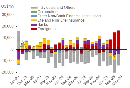 With super-long yields more in focus now we see this as a factor that will likely discourage the BoJ from being perceived as shifting to a more dovish stance. So we are not surprised by the comments from Noguchi-san and Ueda’s reluctance to discuss long-term yield moves. A return to yen selling could fuel renewed inflation risks and put further upward pressure on long-term yields. Hence, we are maintaining our view that the BoJ will hike rates again, at the September meeting. Nationwide inflation data was stronger than expected in data released today while ‘shunto’ wage negotiations suggest we will have another year of wage increases close to levels not seen since the early 1990s. While, Stephen Miran (Trump’s head of his Council of Economic Advisors) stated yesterday that the US maintains its policy of wanting a strong dollar, most market participants assume Trump wants a weaker dollar. Japanese investors are huge holders of foreign bonds and are likely to increase their hedging of dollar depreciation risks, especially as hedging costs cheapen as the Fed renews monetary easing. MoF international investment position data show Japanese investors own JPY 350trn worth of foreign long-term debt securities ($2.4trn) and hence small shifts in FX-hedging would result in considerable yen buying.