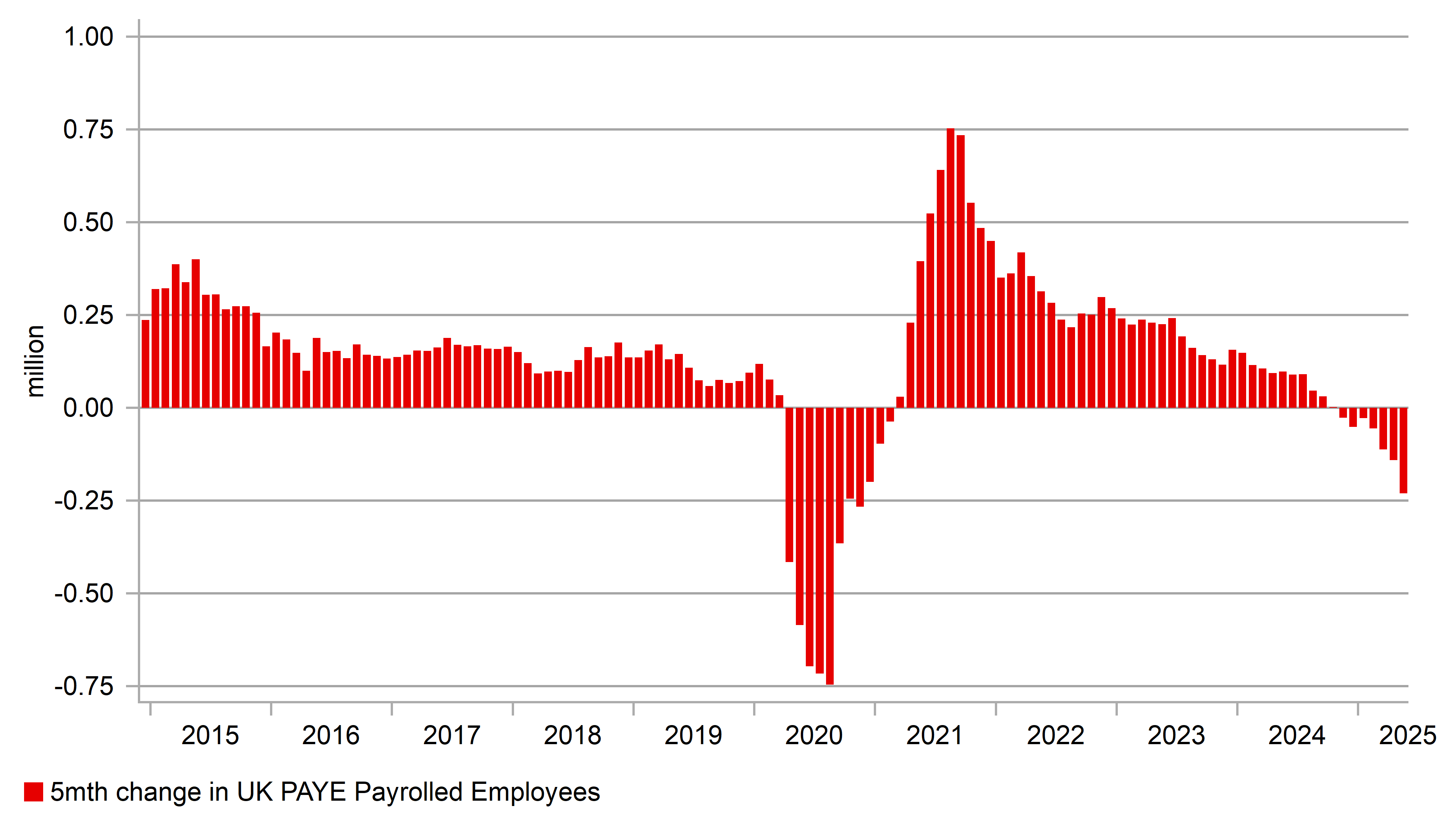 After an impressive 0.7% Q/Q GDP increase in Q1, the economy has slowed markedly and clearly the consumer remains cautious given the labour market looks to be weakening following the NICs tax increase that went live in April. That has had an impact on keeping inflation higher and this mix of still high inflation and increased job insecurity is weighing on consumer spending. Retail sales plunged 2.7% in May with food, household goods and clothing and footwear sales all falling notably. April m/m GDP fell 0.3% with the index of services growth falling 0.4%. Since the start of this year PAYE measured employment has dropped by 230k. This is by the worst performance of the labour market outside of covid since the data series began in 2015.