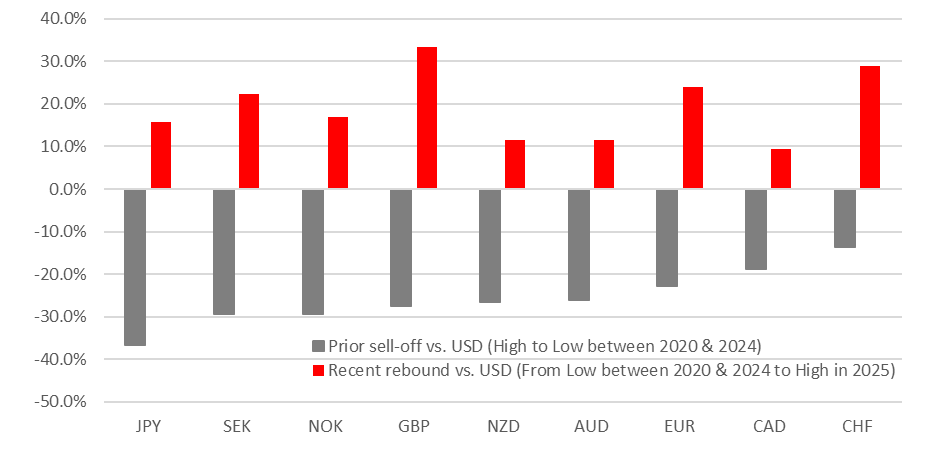 The Scandi currencies of the NOK and SEK have strengthened sharply in the first half of this year alongside the other European currencies of the CHF and EUR. The SEK was the top performing G10 currency strengthening by 17% against the USD compared to an increase of 13.8% for the EUR and 13.0% for the NOK. It marks a sharp turnaround for both Scandi which had fallen to deeply undervalued levels in recent years. From the high point in May 2021 to the low point in January this year, the NOK had fallen by 29.3% against the USD. Similarly from the high point in January 2021 to the low point in September 2022, the SEK has weakened by 29.3% against the USD. The Scandi currencies had suffered the biggest sell-offs against the USD alongside the JPY prior to the reversal of the USD’s multi-year upward trend (see chart below). It set the stage for more powerful rebounds for NOK and SEK when the tide turned. The NOK and SEK have rebounded relatively more strongly than the JPY so far but have lagged behind the rebounds for the EUR and GBP.