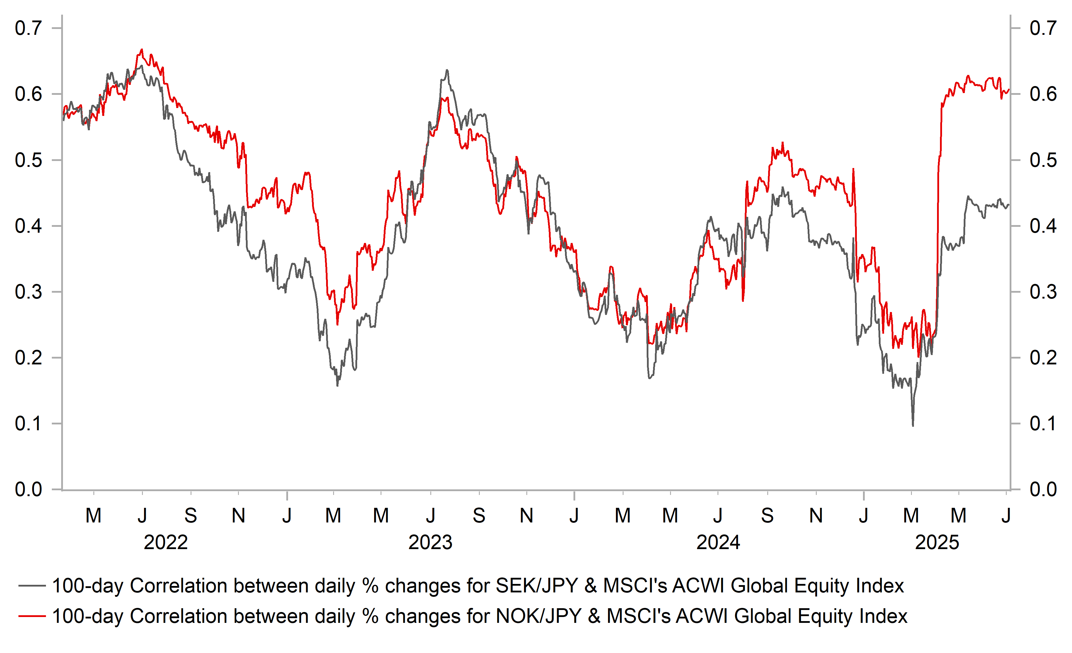 After the strong start to the year both Scandi currencies have recently lost upward momentum. Given broad-based USD weakness, the loss of upward momentum for NOK and SEK is more evident against the EUR. EUR/SEK hit a low of 11.665 in April but has just risen back above resistance from the 200-day moving average at around the 11.200-level. Similarly, EUR/NOK hit a low of 11.261 in April and has since risen back above the 11.800-level closer to where it has been trading over the past year. The turning point for both EUR/SEK and EUR/NOK was President Trump’s Liberation Day tariffs announcement in early April. Even though global investor risk sentiment has improved significantly since the worst point in April, it has been notable that both the NOK and SEK have been unable to regain their prior bullish momentum.