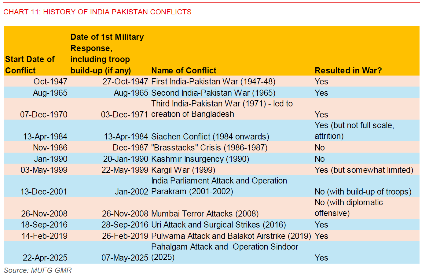 - Ultimately, history is an imperfect proxy and certainly this time could be different. In the post 1999 Kargil War episodes, there were generally off-ramps found relatively quickly between India and Pakistan, and the military responses have generally been more muted compared with the current 2025 episode.