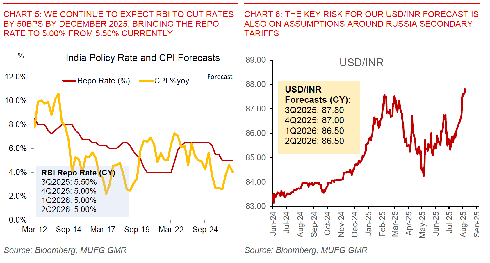 - We forecast USD/INR at 87.00 by Dec 2025 and 86.50 by March 2026, with the assumption that India’s tariffs are eventually lowered to 20% by October, and also we are not assuming material Russia secondary tariffs on India on an extended basis.