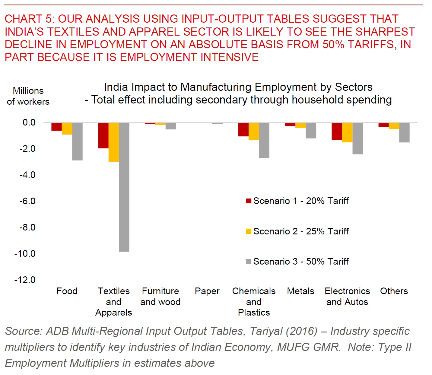 - The key underlying factor is that the sectors most negatively impacted by high tariffs also happen to be labour intensive ones such as textiles, gems and jewellery, toys manufacturing, food processing, among many others. These are incidentally the very areas that India needs to absorb its burgeoning population into good jobs (see Chart 5). As such, there is also a meaningful distributional and social impact for India beyond just the headline GDP hit.