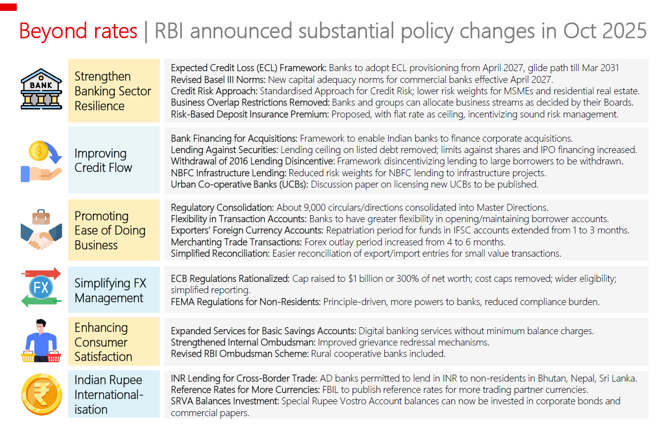 Source: RBI Oct 2025 Monetary Policy, RBI Oct 2025 Statement on Developmental and Regulatory Policies, Various News Articles, Vinod Kothari Consultants, MUFG GMR. Note: RBI’s policy proposals, compiled for information purposes