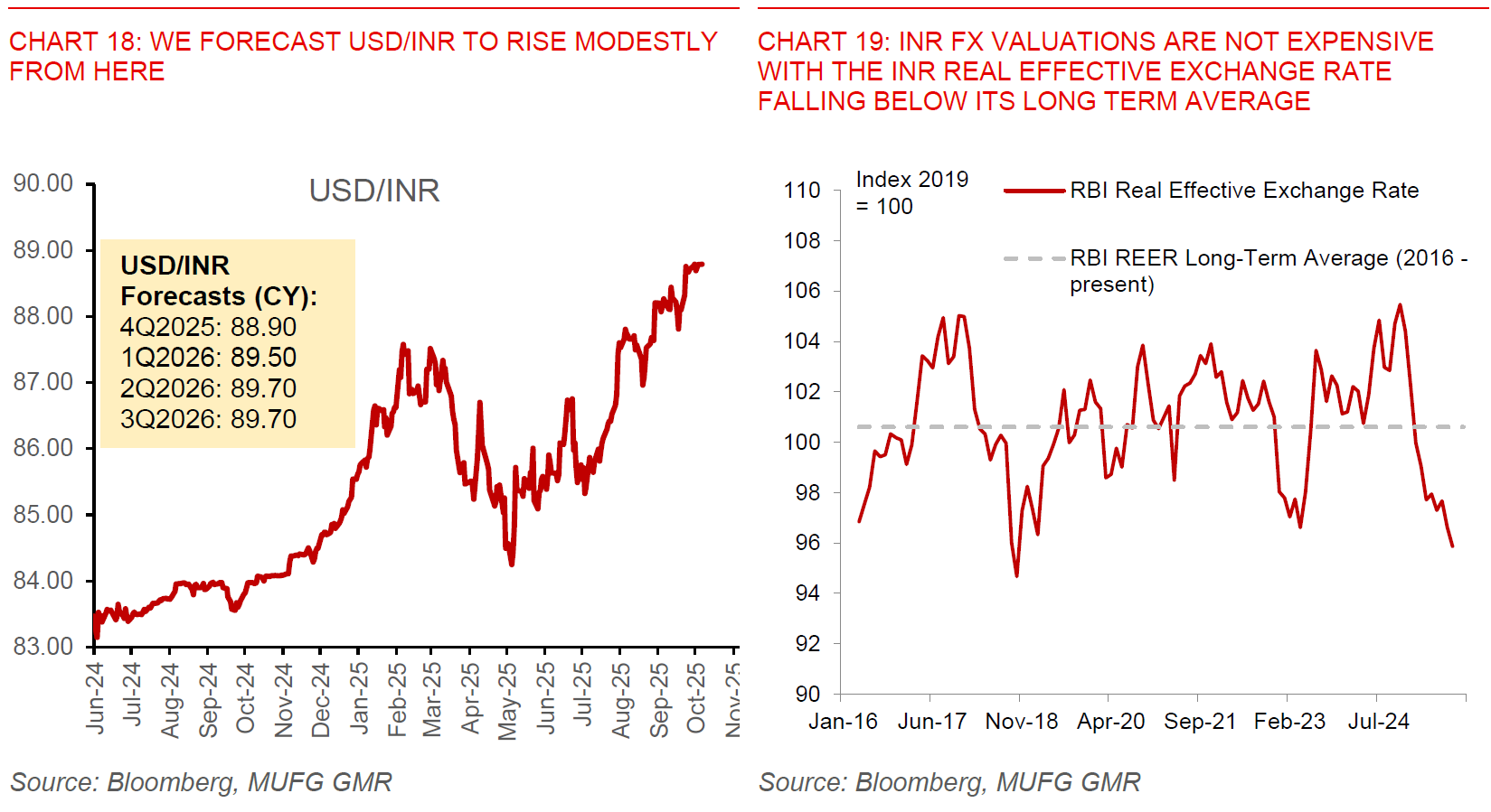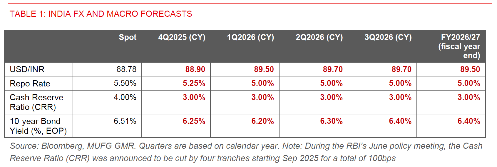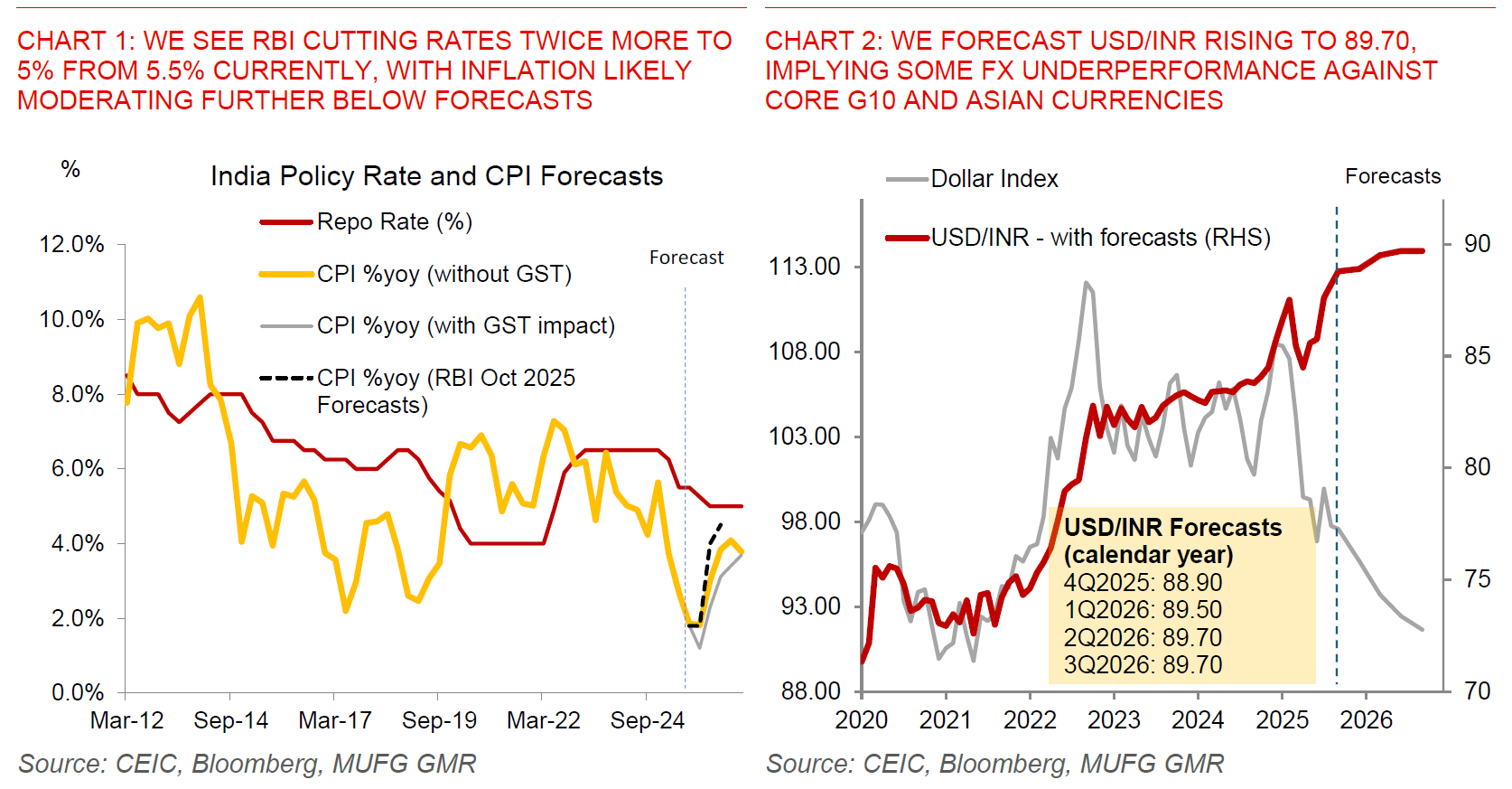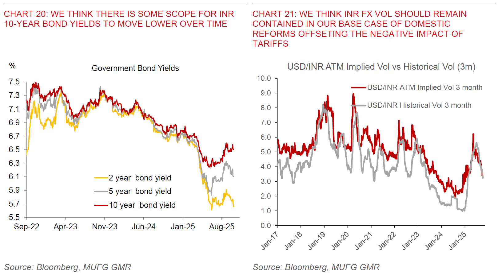 Beyond these external headwinds, our INR FX and rates forecasts also incorporate the offsetting positive impact of domestic structural reforms, including from recent GST tax cuts and simplification, together with RBI’s recent host of regulatory changes to improve credit flow and improve the ease of doing business, among other objectives.