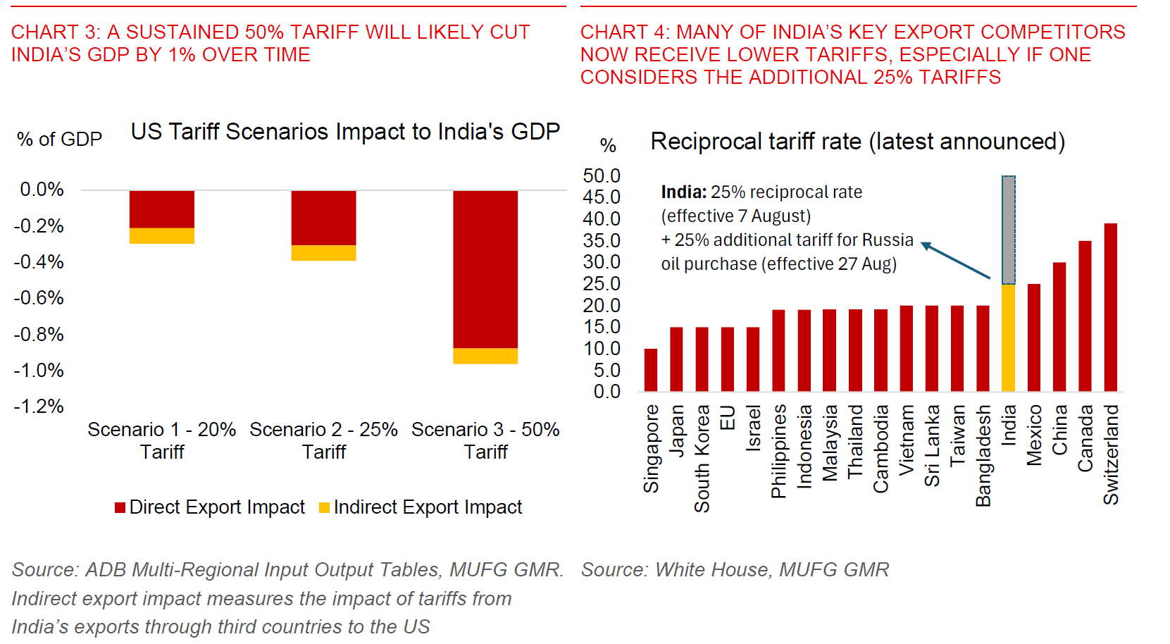 In addition, it is just as important to take opportunity costs into account. What is far more impactful for India in our view are the potential lost opportunities in terms of future manufacturing FDI arising from the tariffs, beyond the near-term growth hit. The likely slowing in terms of export-related manufacturing FDI implies an even greater pressing need to create alternative growth drivers, and especially employment-intensive ones given India’s burgeoning population.