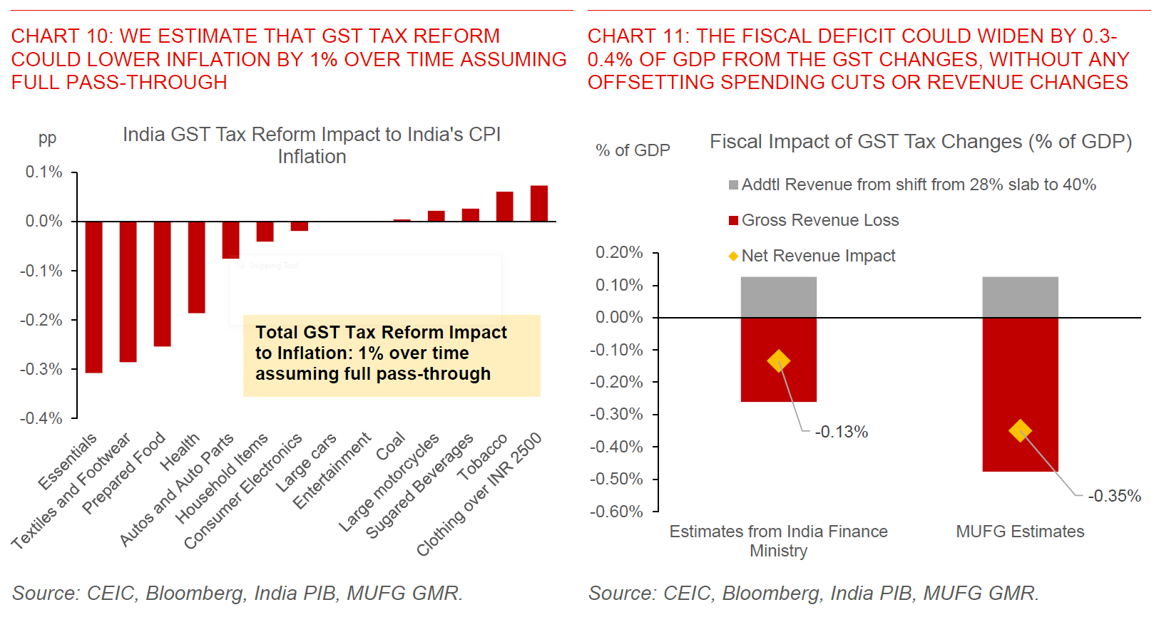 Source: India PIB, Various News Articles, Bloomberg, MUFG GMR. Note: Selected items and tax changes
