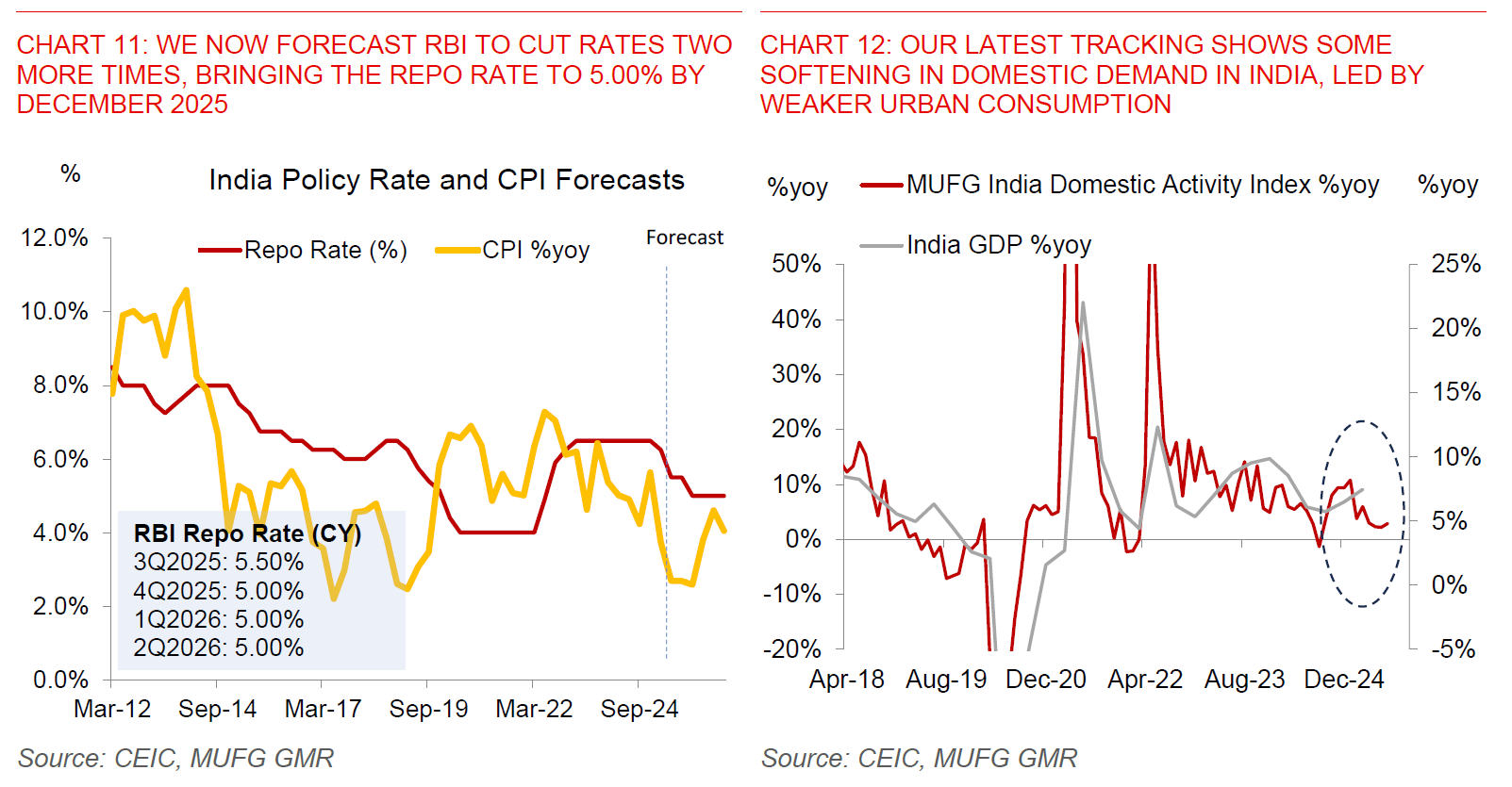 We also now forecast RBI to cut rates two more times, bringing the repo rate to 5.00% from 5.50% currently. This compares with our previous forecast of one more cut. We see these two cuts likely coming in the October and December meetings, and for the RBI to keep rates on hold thereafter till 2H2026. Our latest tracking of domestic economic activity shows that growth in India has softened over the past few months, led by weaker activity in urban consumption.