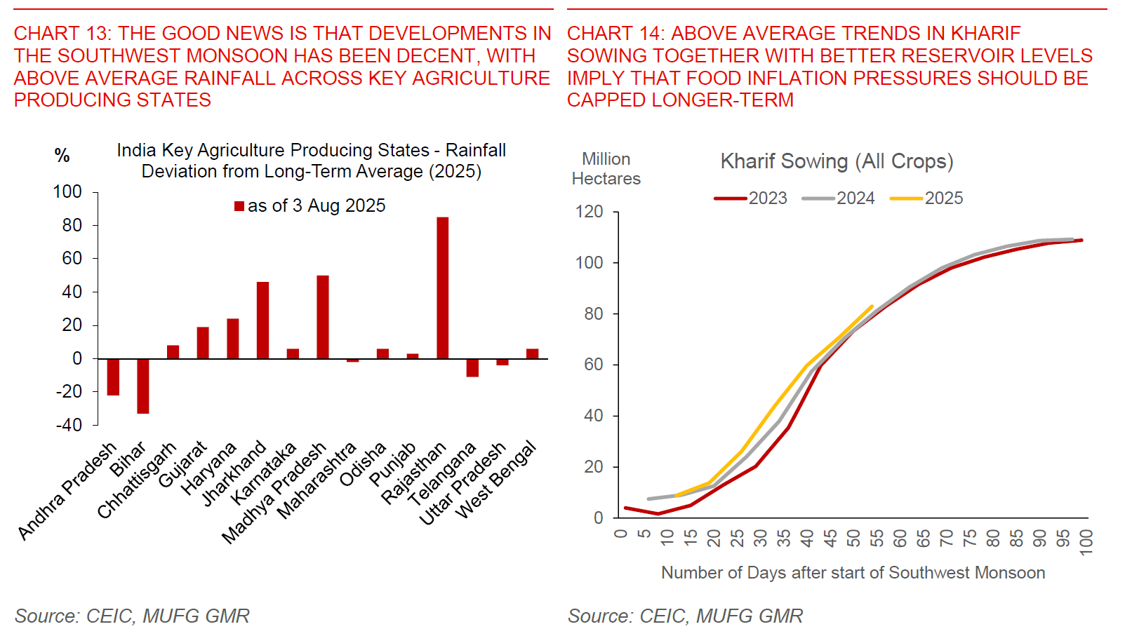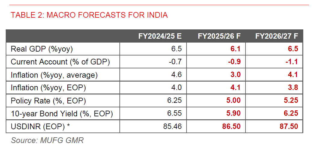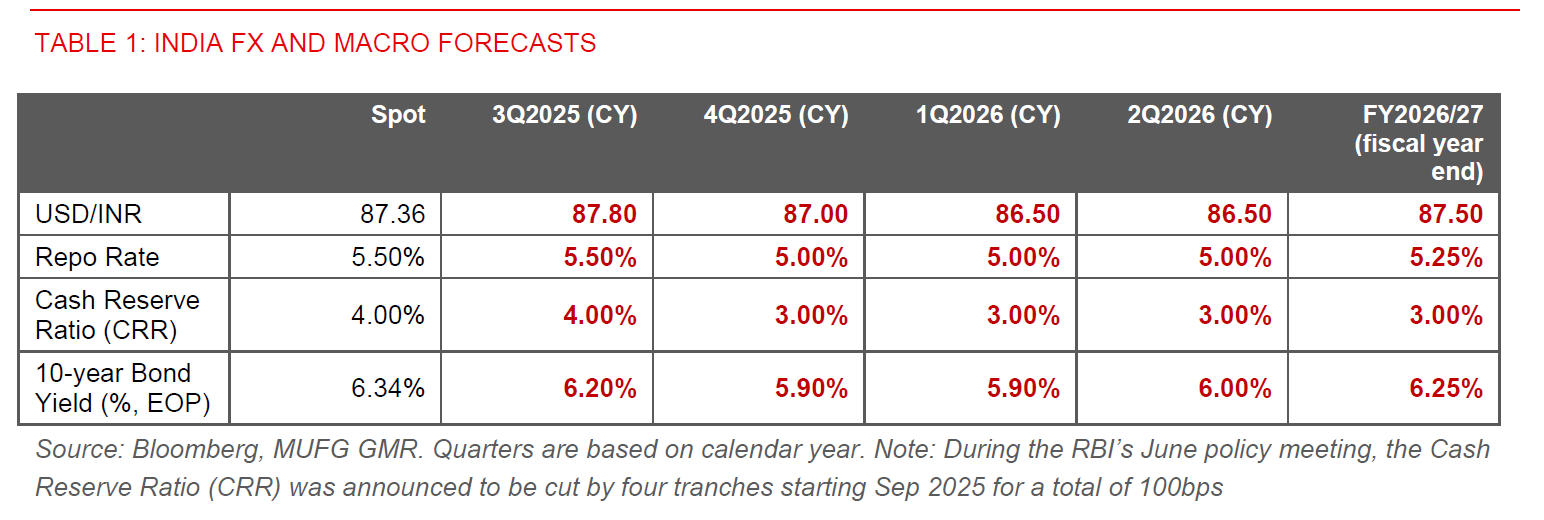 - We also now forecast RBI to cut rates two more times, bringing the repo rate to 5.00% from 5.50% currently. This compares with our previous forecast of one more cut. We see these two cuts likely coming in the October and December meetings, and for the RBI to keep rates on hold thereafter till 2H2026. Domestic positives such as low inflation, a decent Southwest Monsoon, coupled with supportive monetary and fiscal policy are likely to remain key local drivers.