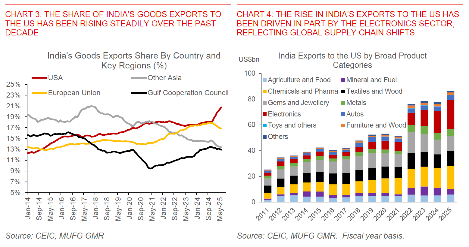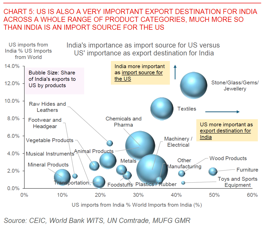 Secondly, the US is also much more important as an export destination for India across a whole range of products categories, more so than India is a source of import for the US. From a macro perspective, this implies that the US could more easily source for supplies from alternative import locations, but conversely it is much harder for India to diversify away from the US across different sectors. As such, India’s export markets may be hit harder perhaps much more than the headline reciprocal 25% tariff rate suggests.